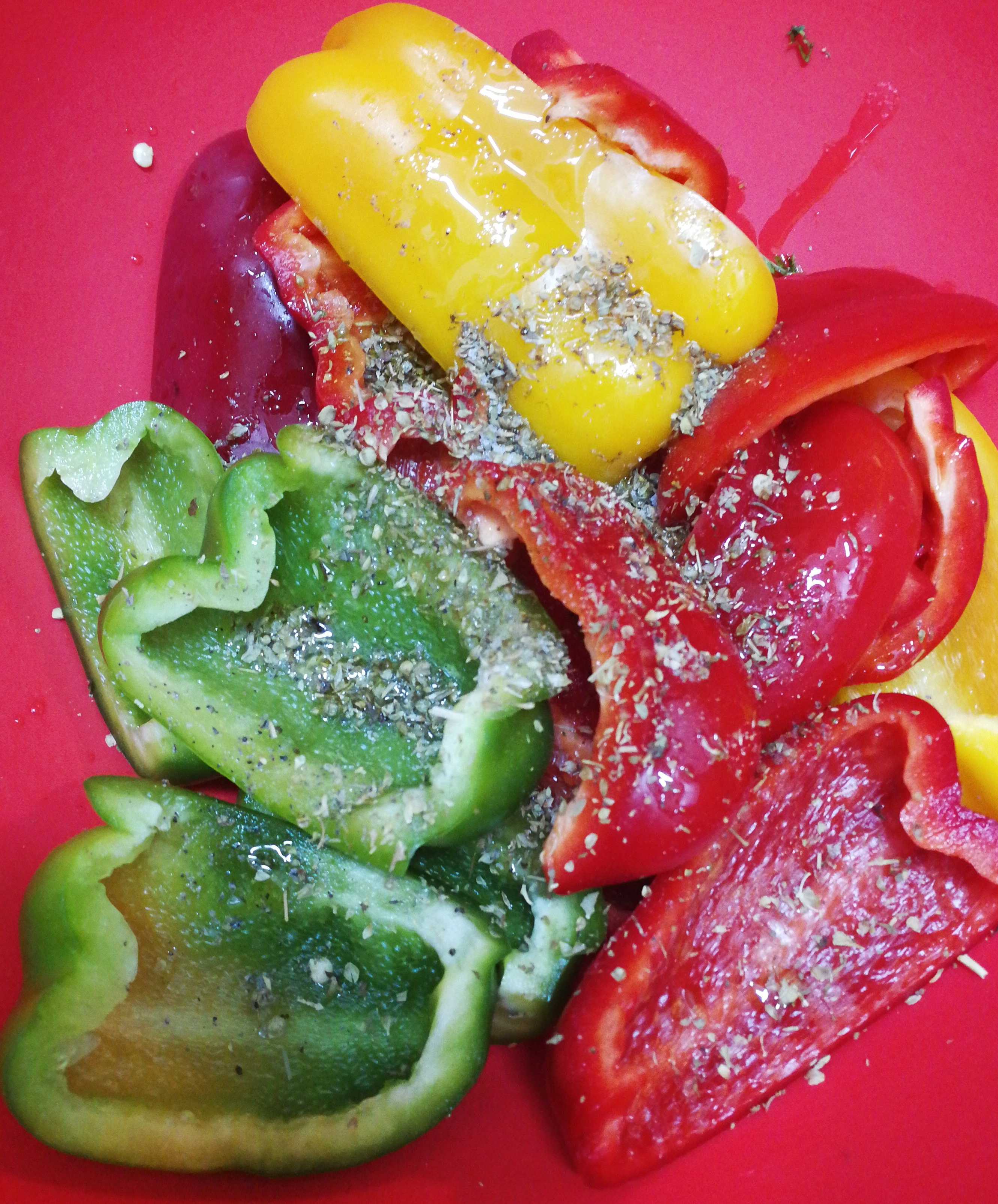 - In a large bowl, toss the peppers with the olive oil, fresh mint, oregano and salt and pepper (to taste).