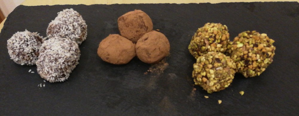 - Place your coconut in a bowl, or on a plate. Do the same for the cocoa powder and the pistachios.