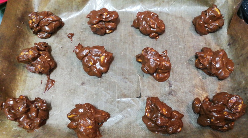 You also don’t need a slow cooker to make these, but it makes the melting process of the chocolate and butter more hands-free, which was perfect when I had some evaluations to write up. After the hour of melting, I simply stirred in the almonds and pretzels and spooned the mixture into mounds on a lined baking sheet.