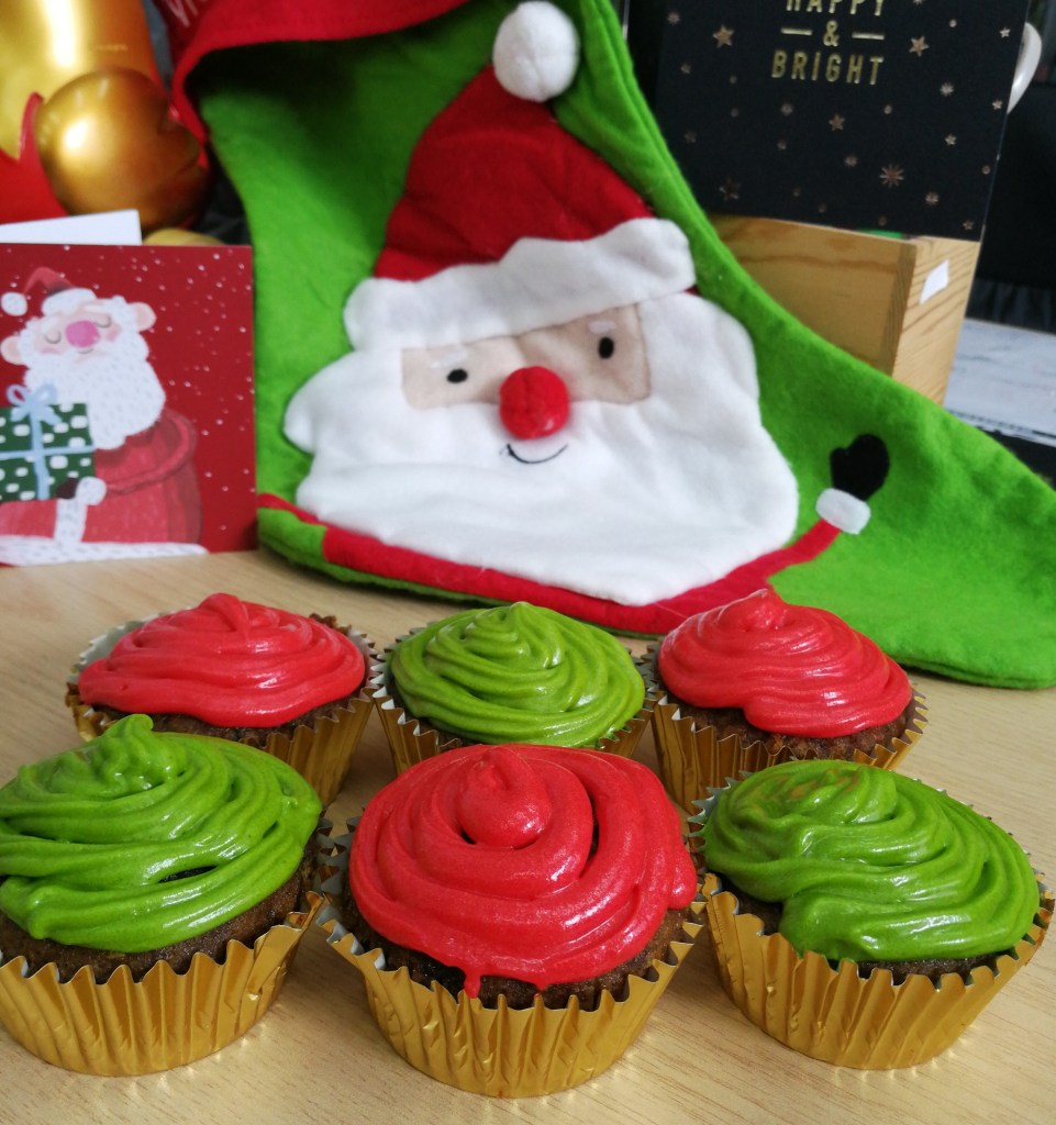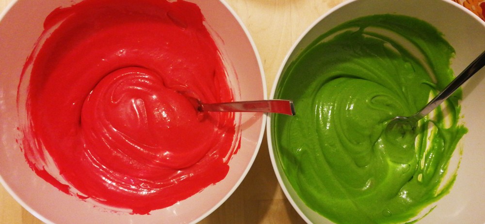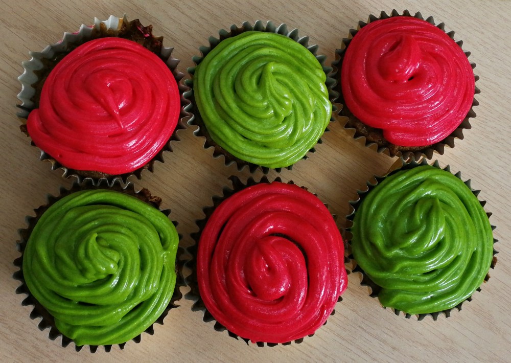 A word about these carrot cupcakes. You can make them any time of year, and change the colour of the dye to match whatever holiday or event you’re making them for. But, seeing as it’s Christmas, I went with the traditional red and green.