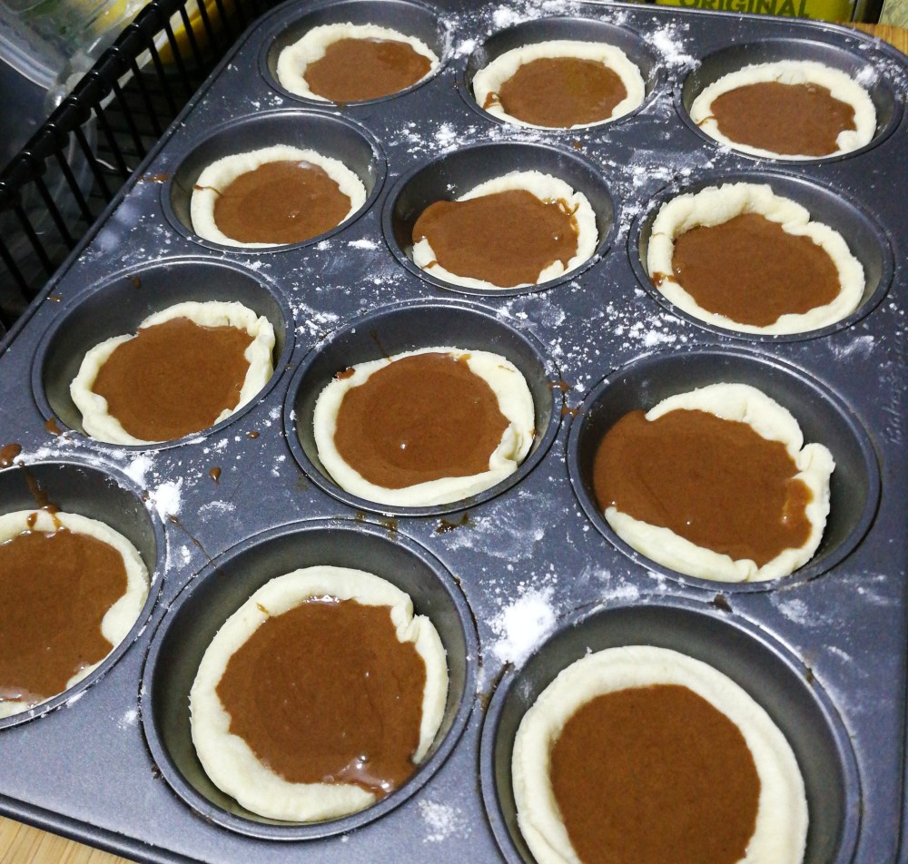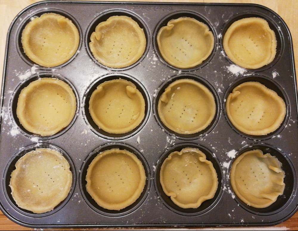 - Using a ramekin, make 12 circles of dough, and line each cupcake mold with pastry. Prick each pastry cup with a fork along the base.