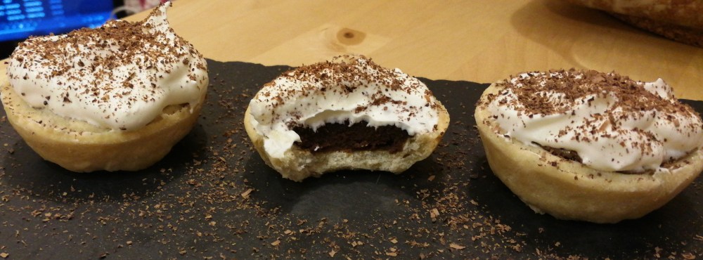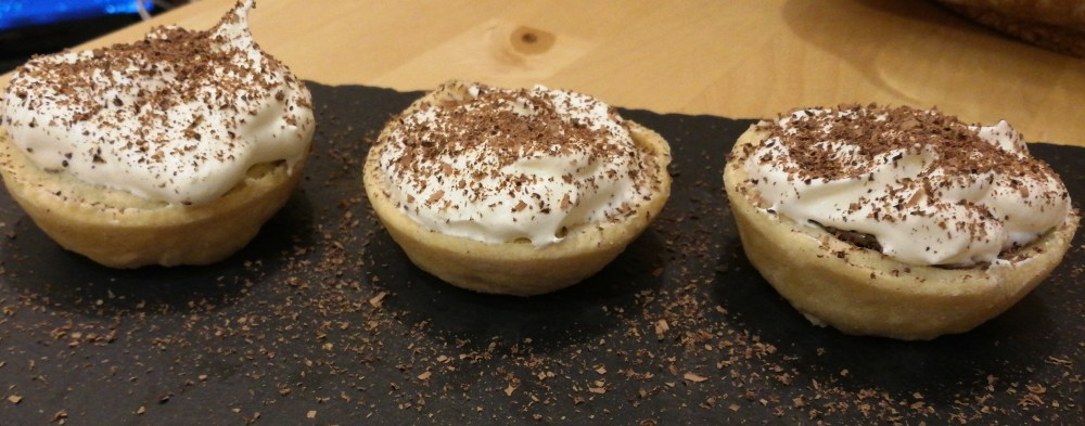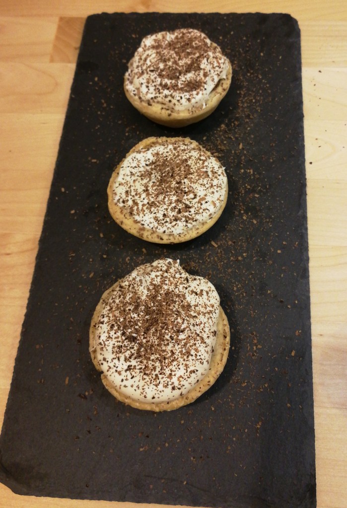 - When ready to serve, whip the cream until soft peaks form. Spoon over the pies, and finish with chocolate gratings/shavings.