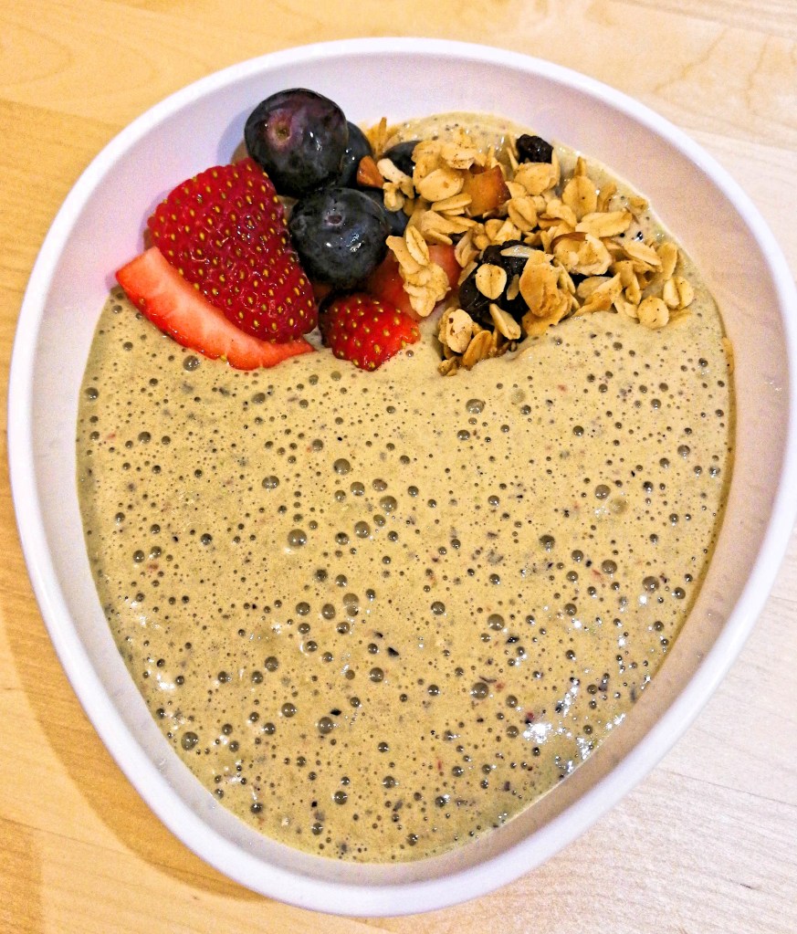 With a smoothie bowl, you want to add less liquid than normal because you want it to be a bit thicker. It also makes it easier to layer fruit and granola on the top.