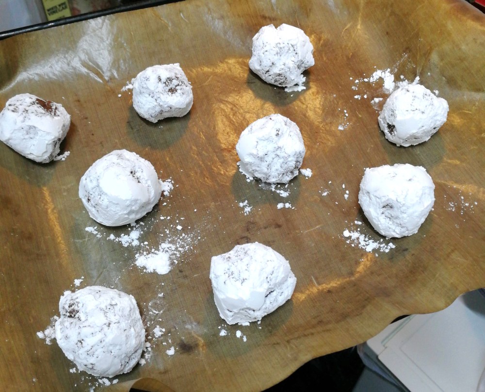 - Using a cookie or coffee scoop, roll the dough into 1 and a half tablespoon balls. Roll each ball in icing sugar, and place on the baking tray.