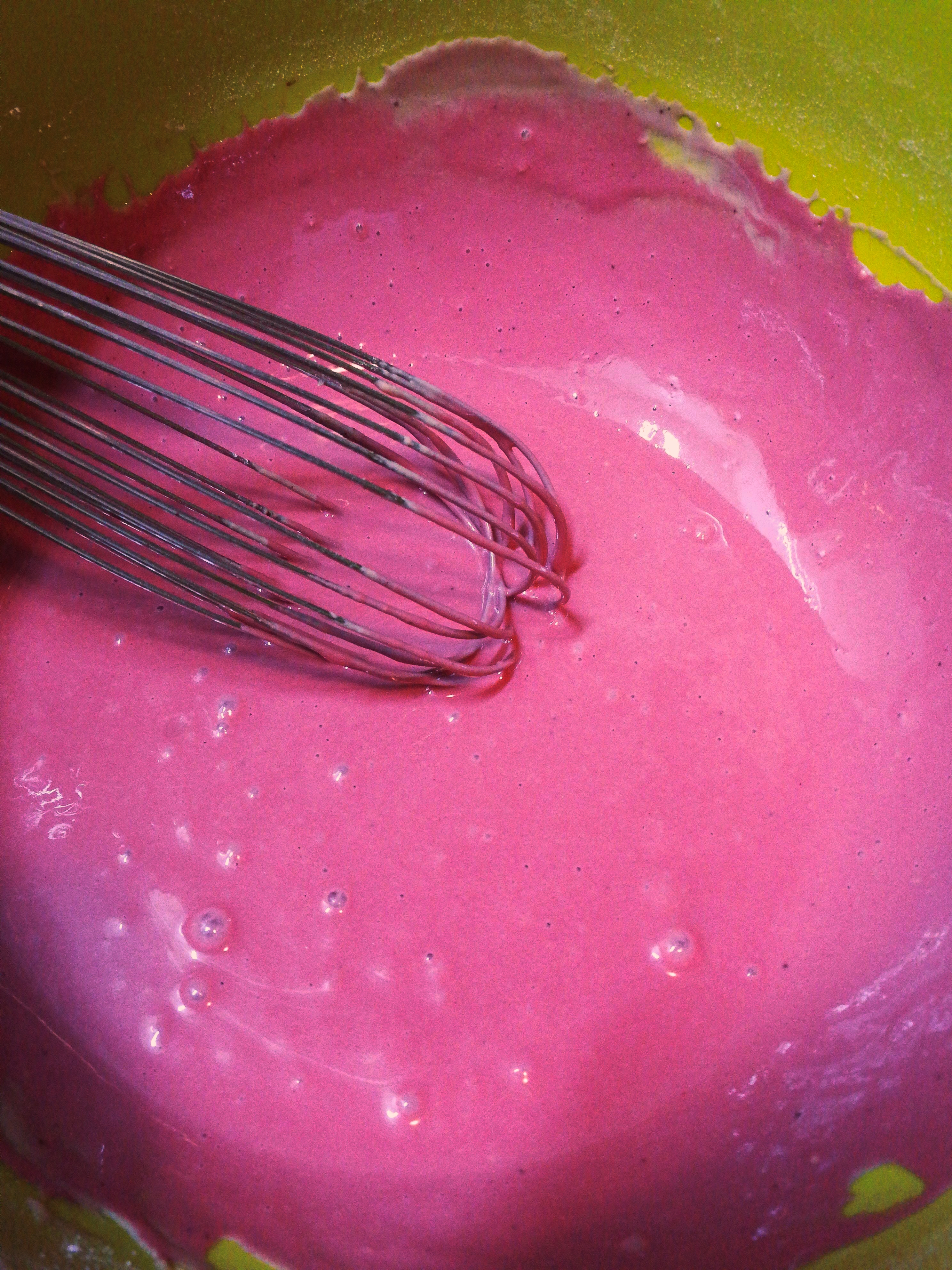 - Pour the wet mixture into the dry mixture and whisk until everything is well incorporated. Add food colouring, and whisk until desired colour is achieved. Set aside.