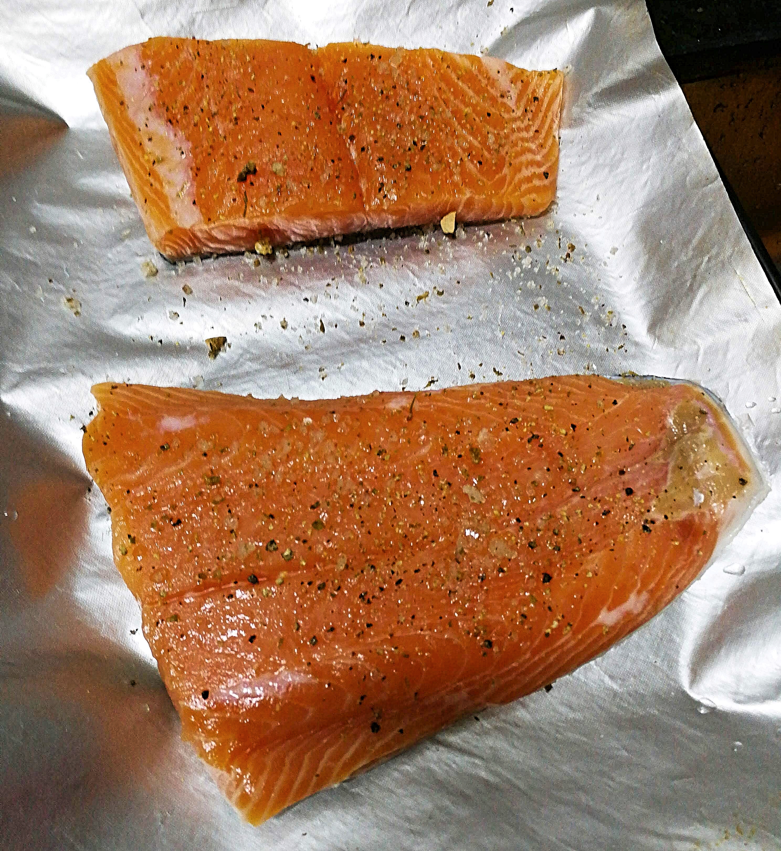 1. Preheat the oven to 170C. Line a large baking dish with tin foil, and place the salmon skin-side down. Season with salt and pepper.
