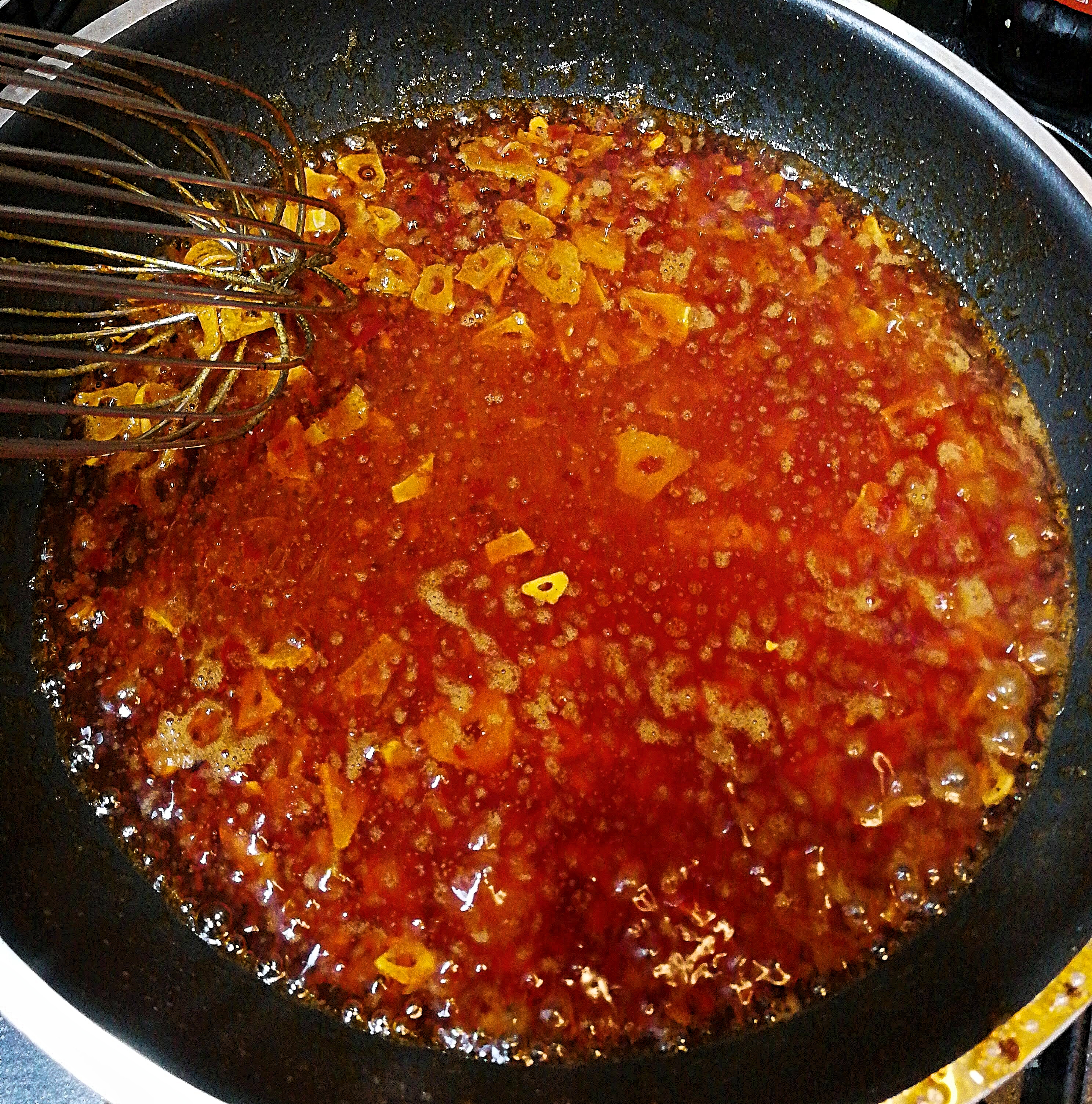 3. Add the garlic to the butter and cook for 30 seconds, then add the olive oil and harissa. Whisk well.