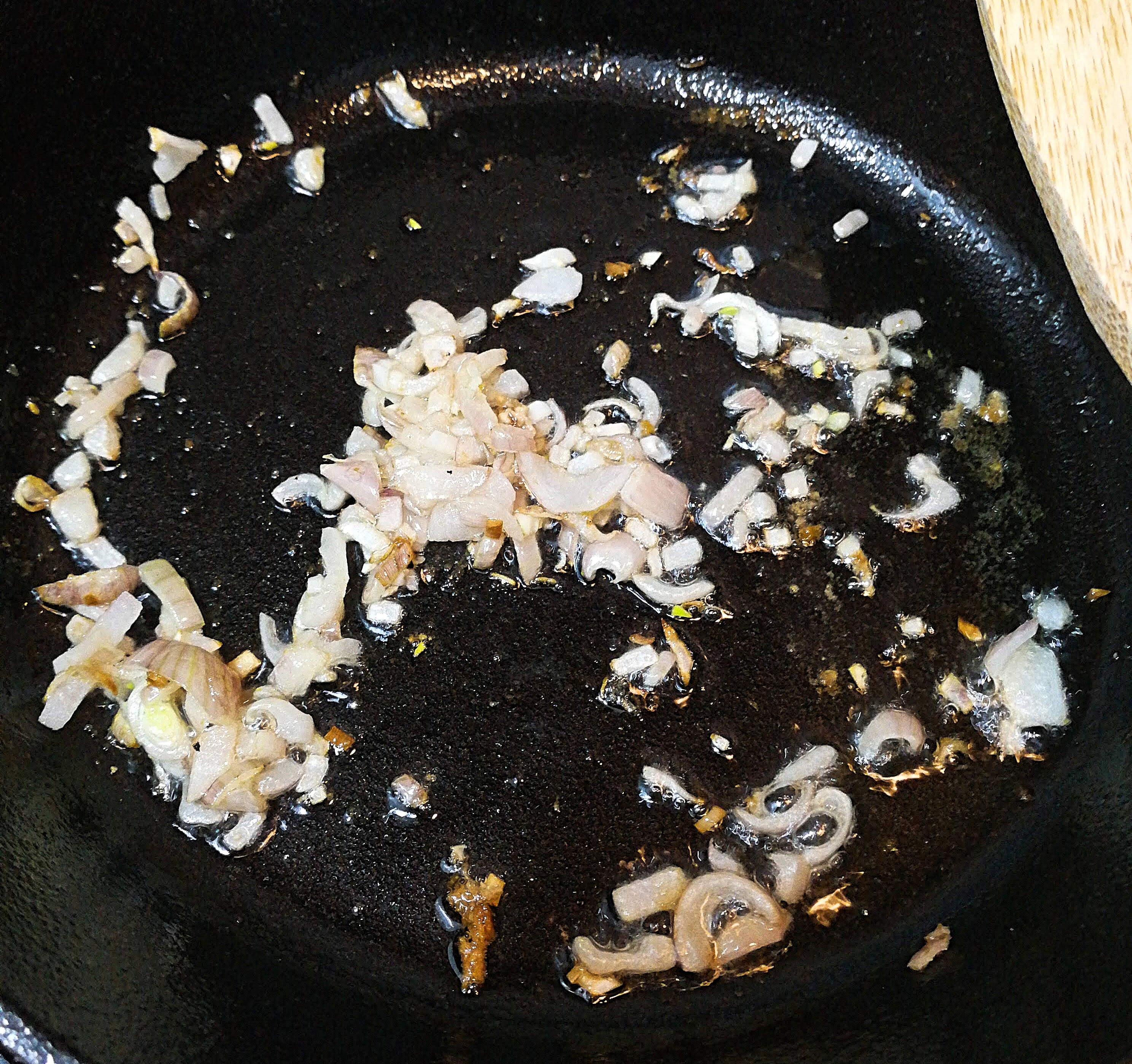 - Add the shallots to the skillet and cook for 2 – 3 minutes until golden. Add the garlic and saute for 1 minute.