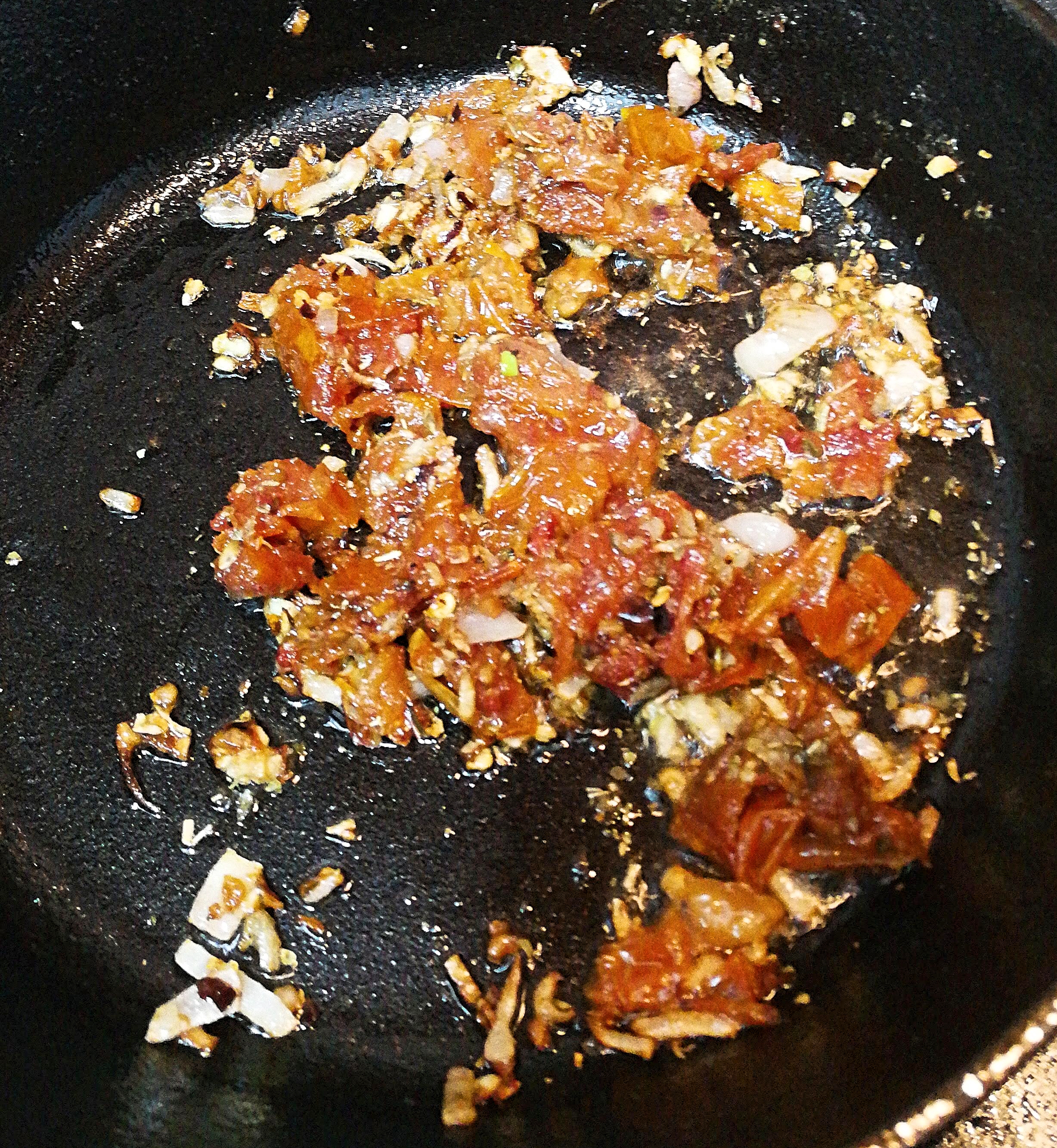 - Add the sun-dried tomatoes, oregano and red chilli flakes. Saute, stirring occasionally, until tomatoes are soft.
