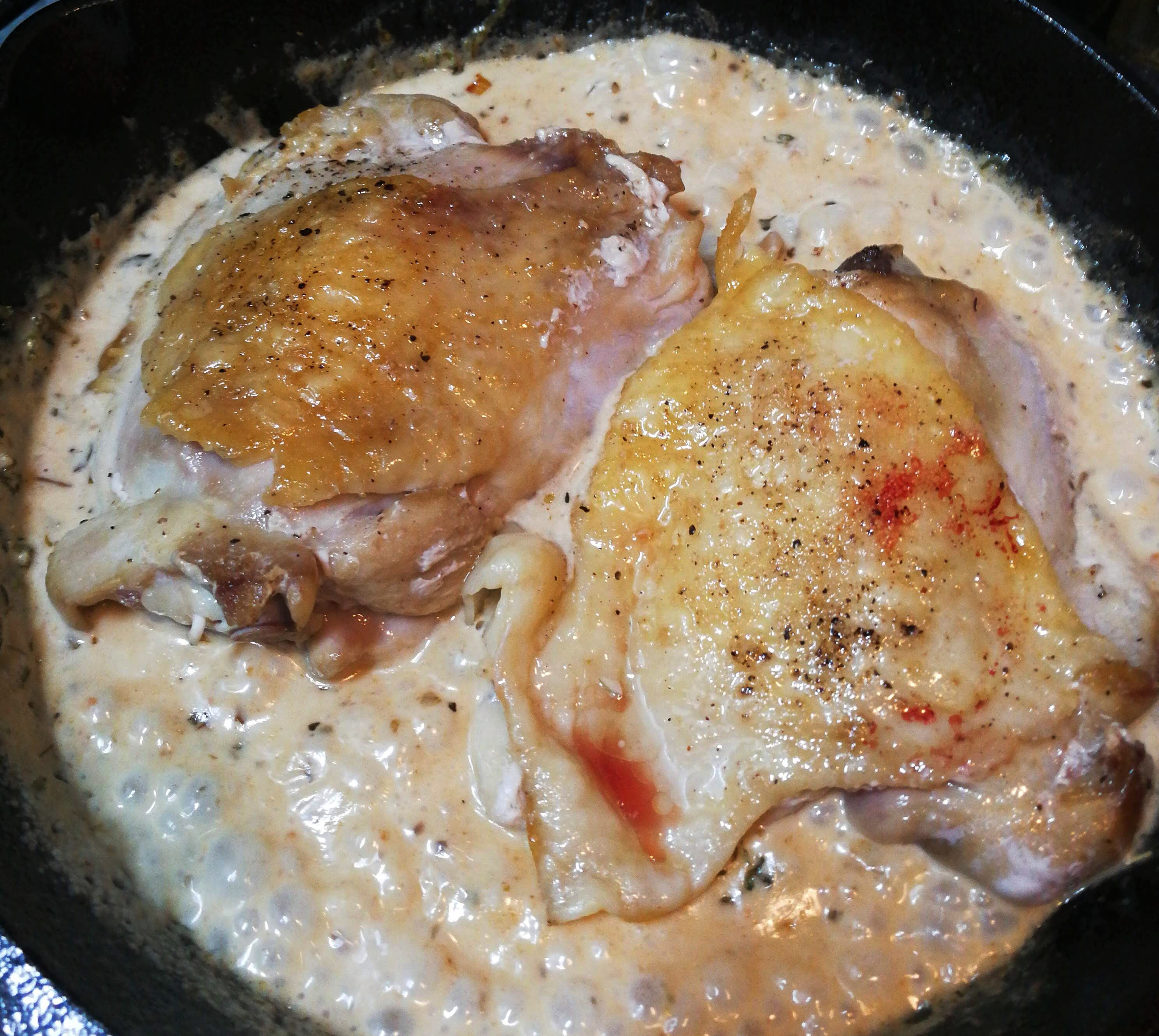 - Place a skillet over medium-high heat. Add the butter and allow to melt. Once melted, add the chicken thighs, skin side down. Allow to cook until the skin is crispy, about 6 – 7 minutes. Remove the chicken from the skillet and set aside.