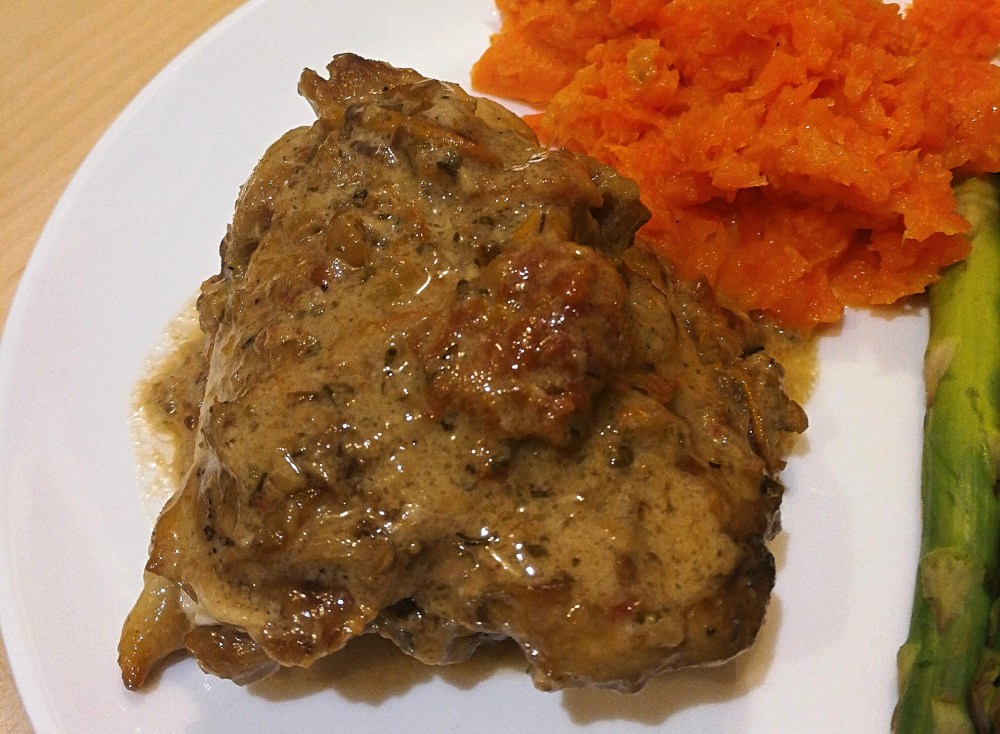 I paired this chicken with mashed carrots and grilled asparagus, which makes for a healthy meal that is also filling. But, the chicken would go great with pasta or rice as well (just spoon the sauce over whatever side you’re having).