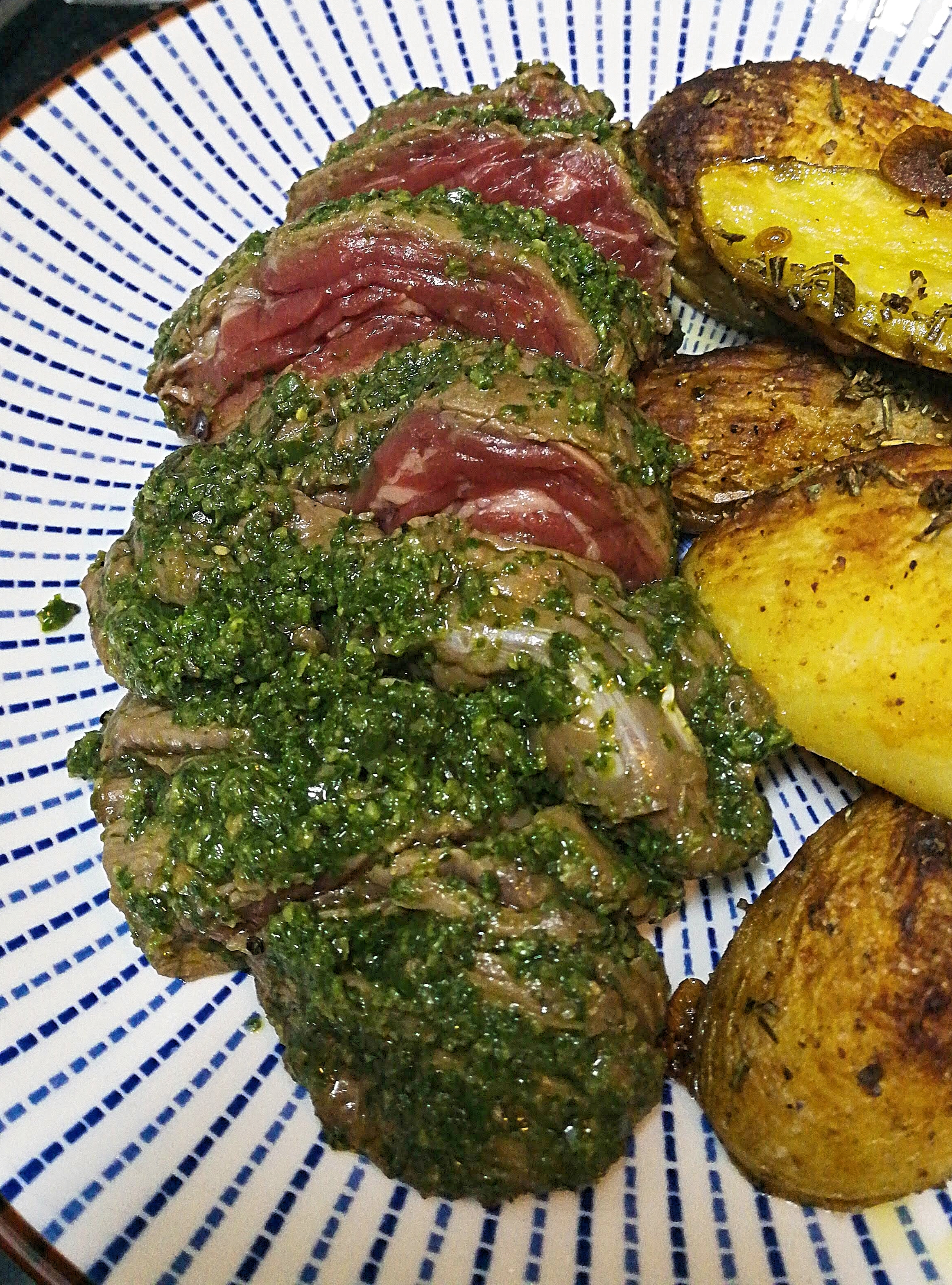 This time, I got myself some hanger steak. I went into the butcher not really knowing what I wanted, I was just browsing. But as I was looking around, I spotted two things that caught my eye (well, everything caught my eye, but I couldn’t afford to buy everything). The duck breast (vacuum-packed, so not plastic free, unfortunately) and the hanger steak. I bought both. The duck recipe will be up in the near future, but for now, I wanted to pass on this incredible chimichurri steak recipe.