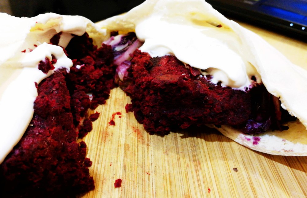 Pita bread, yoghurt and delicious filling of some kind. I mean, it’s a pretty amazing meal in itself. I do love a kebab every now and then, or a falafel. Or… beetroot falafel.