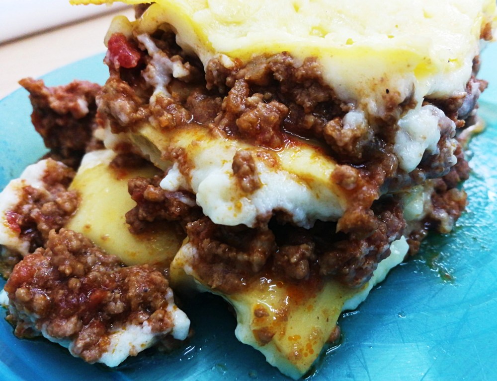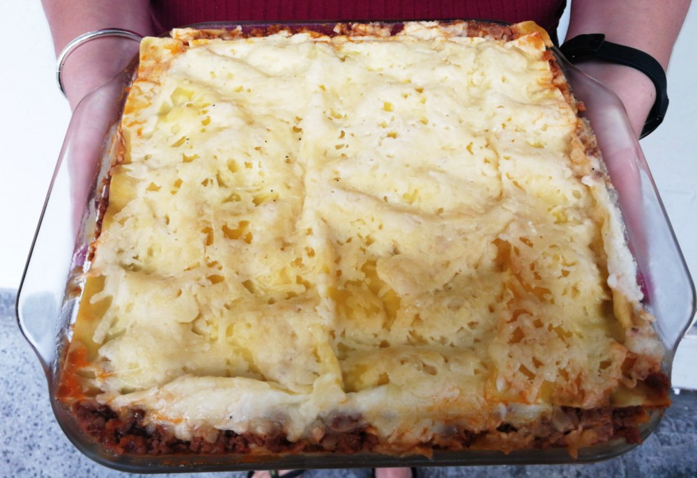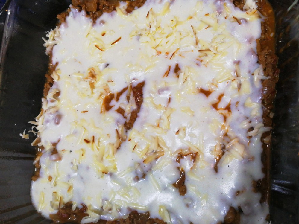 - Grease a 25 x 25 cm Pyrex dish, then layer one third of the meat/aubergine filling into the dish. Ladle a third of the roux over the filling. Sprinkle your choice of cheese combo (about 1/4 of the cheese). Place pasta sheets on top of the cheese. Then repeat with the filling, roux and cheese two more times.
