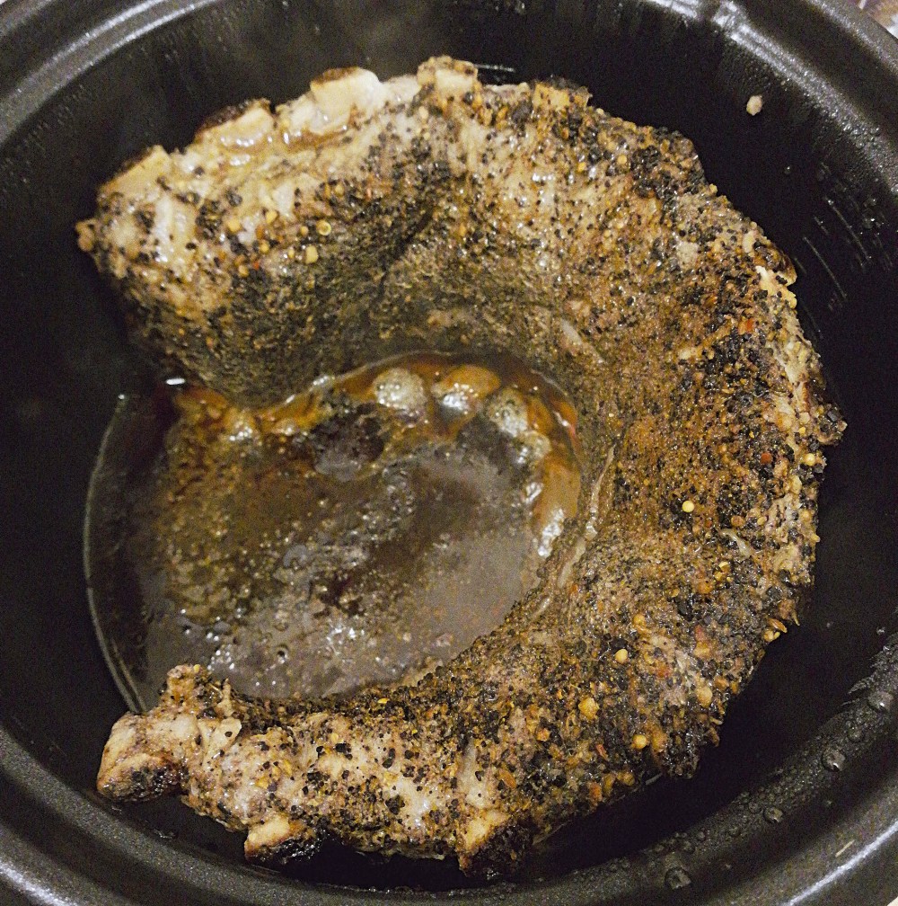 - Place the ribs into the slow cooker, with the bones facing the wall (this prevents the meat from burning or sticking to the slow). Cook on low for 8 hours.