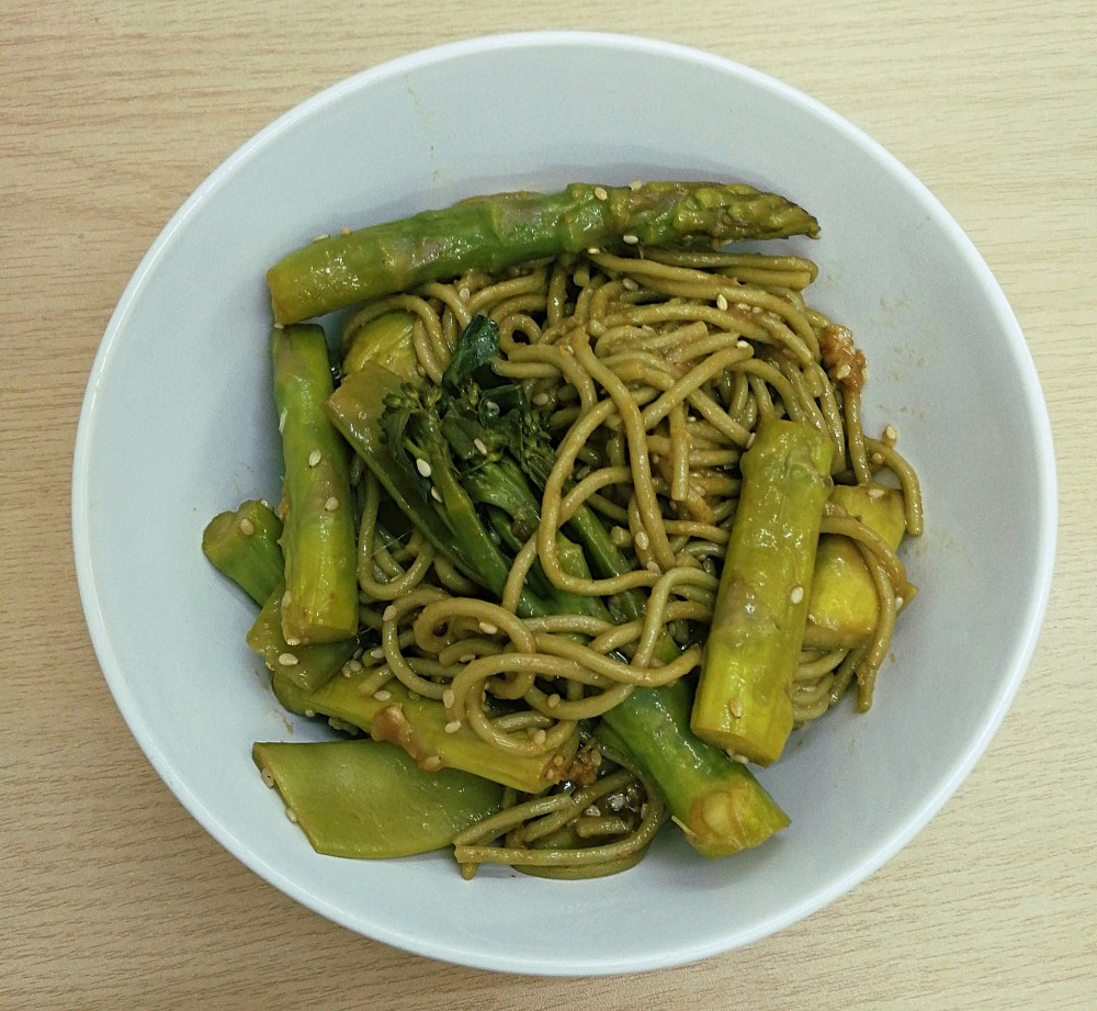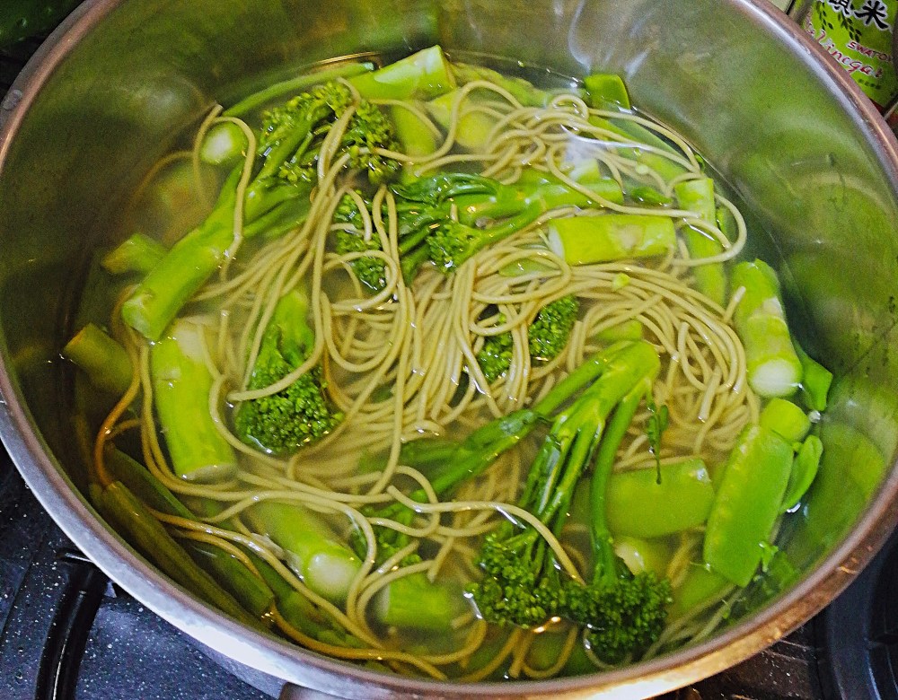 I promised more vegetarian friendly dishes, and this one is easy as anything. I never knew green tea noodles existed until a friend cooked dinner for me a couple of months ago. They’re soba noodles, so they’re lighter that your typical egg and wheat noodles, if that’s important to you.