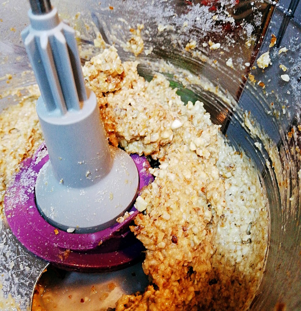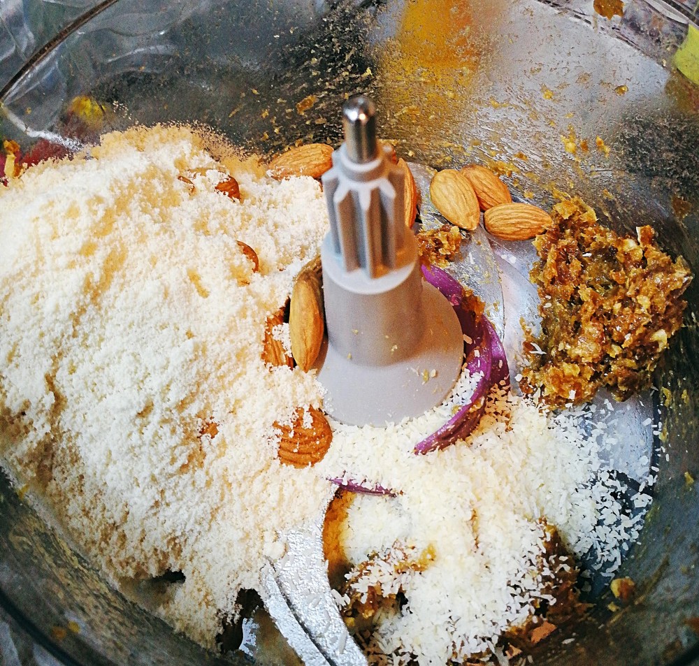 - Add all of the remaining ingredients except the 60 grams of dessicated coconut. Blend until well combined and starting to form a paste.