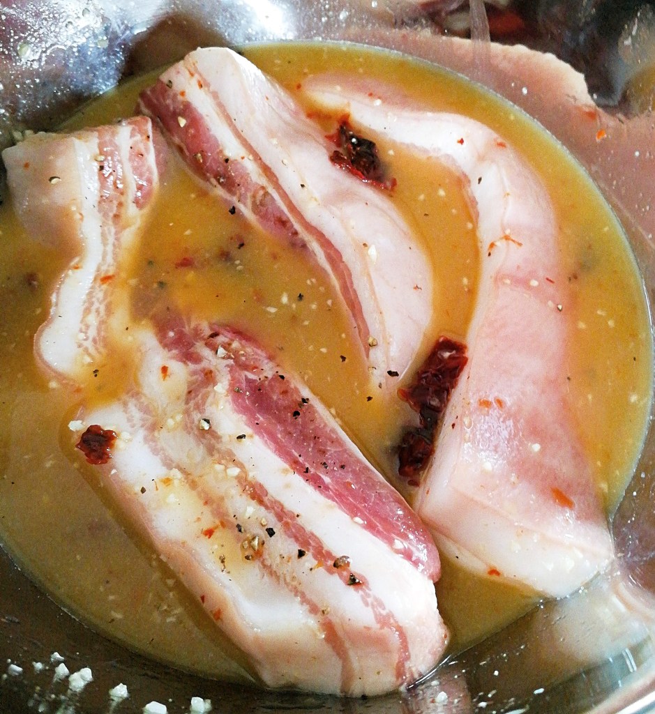 - Combine all of the ingredients for the pork belly in a bowl. Place pork belly in a bowl or shallow dish, and pour marinade over the top. Cover and place in the fridge for at least 4 hours, but preferably overnight.