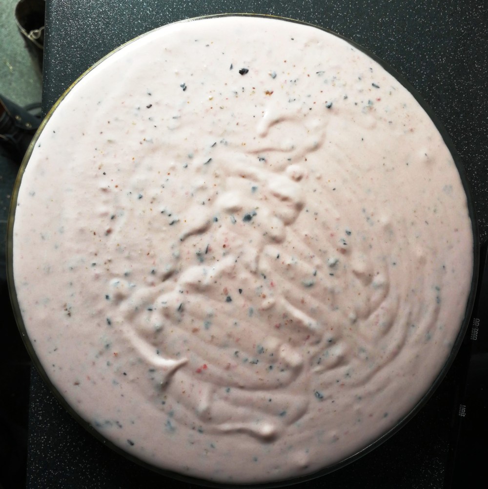 - Remove the biscuit base from the fridge, and pour the batter into the pie dish.