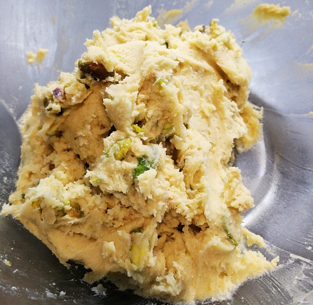 - Add in the flour and mix well. Then beat in the pistachios (you can use a wooden spoon or your mixer for this part).