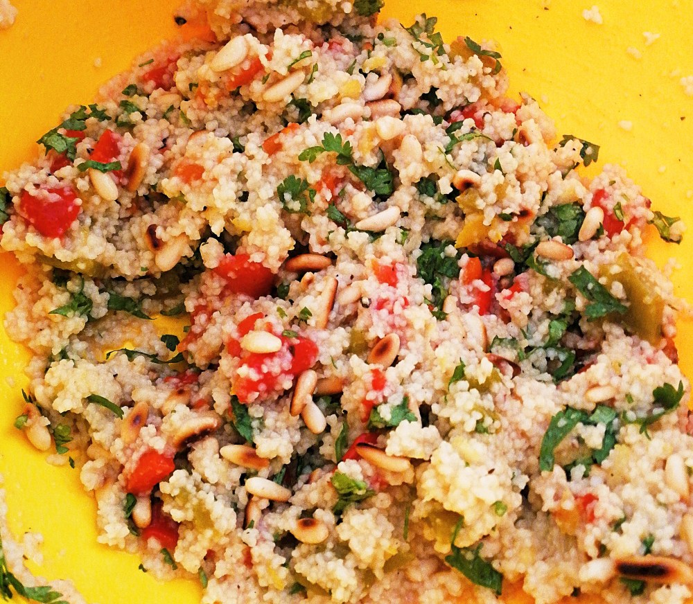 - Drain the cous cous and place in a large bowl. Combine with the pine nuts, peppers, mint, coriander and lemon zest. Season with salt and pepper. Drizzle the lemon juice over the cous cous and mix through.