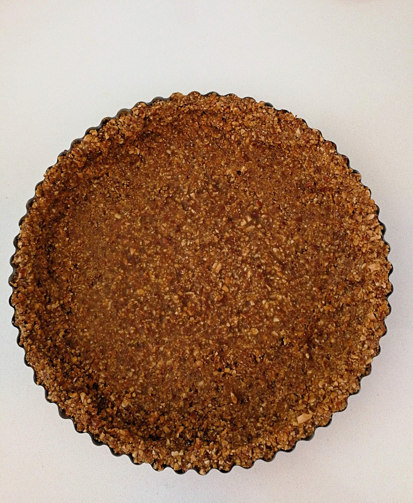 - In a saucepan, melt the butter. Add the melted butter to the nuts and mix thoroughly. Pour the nut mixture into a springform pie or tart tin, and press the mixture into the base and sides. Place in the fridge while you make the filling.