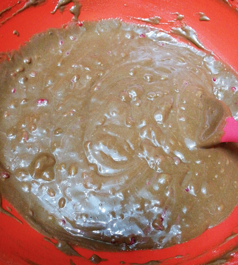 - Stir the wet ingredients into the dry until thoroughly combined. Crumble the frozen raspberries into the mixture and stir through.