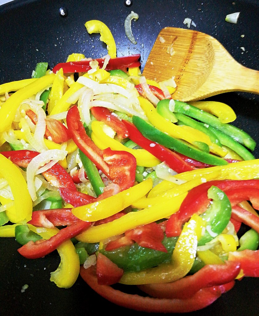 - Place a wok over a medium heat, and add a splash of soy sauce. Add the onion, cook for 4 – 5 minutes. Add the peppers. Cook for 5 – 6 minutes, then add the minced garlic.