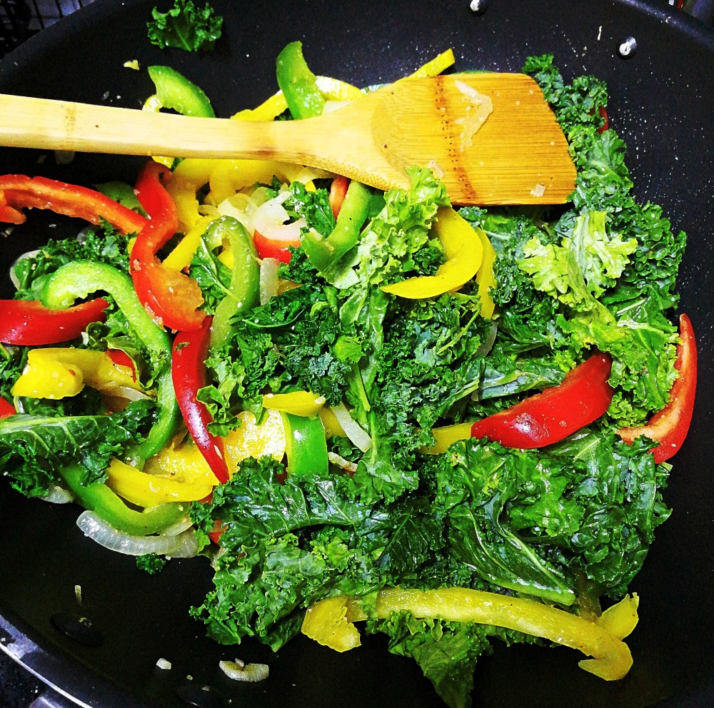 - Season with salt and pepper, add a teaspoon of roasted garlic powder. Then add the kale. Cook for 1 minute.