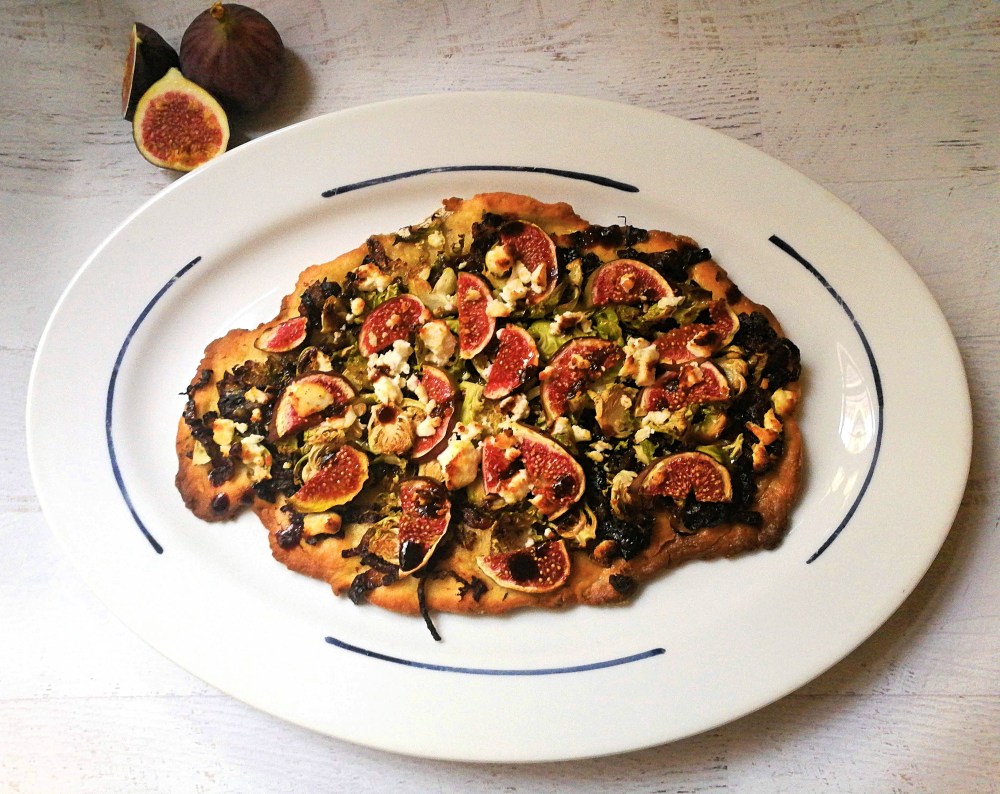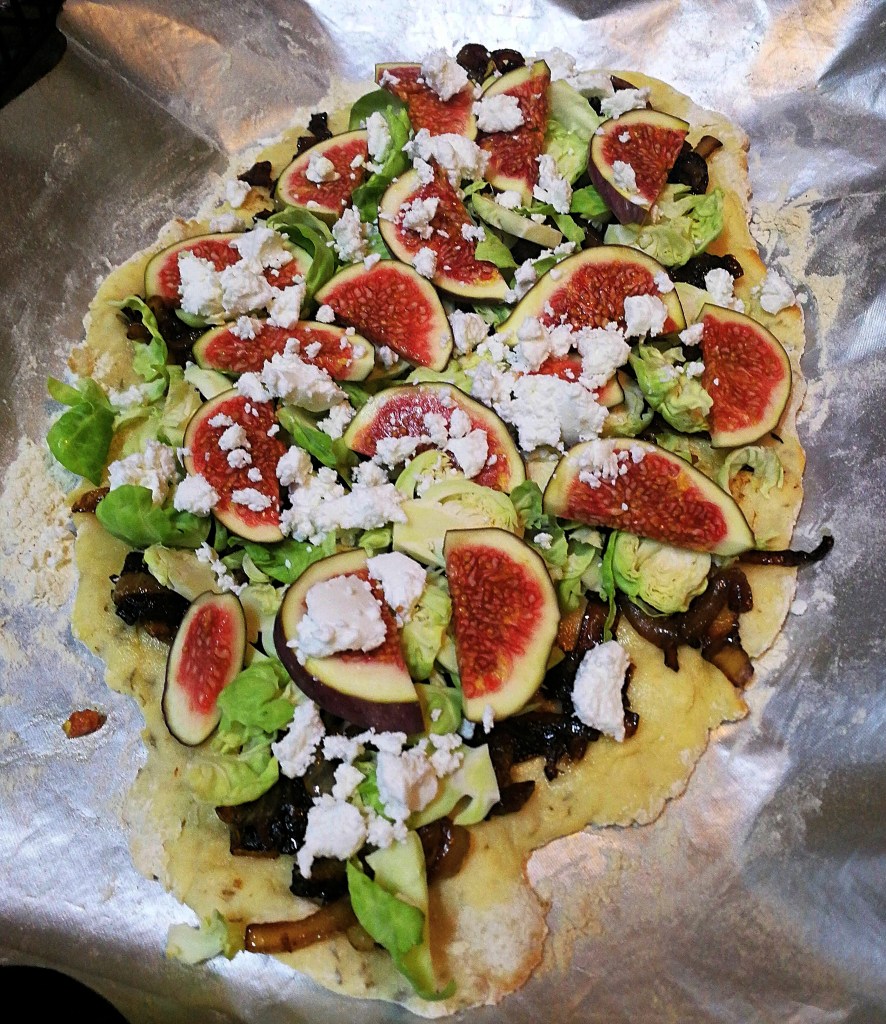 - Scatter the caramelised onions over the flatbread, followed by the sprouts, figs and goats cheese. Sprinkle with salt and pepper.