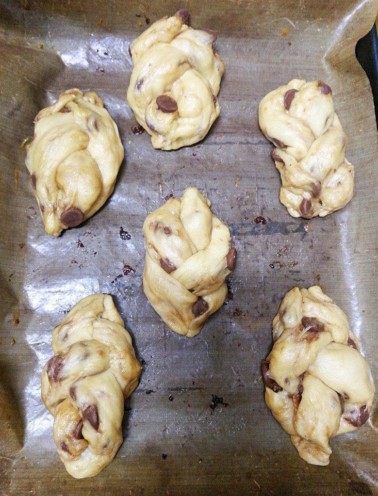 1. Combine all of the dough ingredients in a stand (or handheld) mixer, with a dough hook, and knead until it comes together. Add the chocolate chips and mix them through. Turn the dough out onto a lightly floured surface and knead for 5 minutes or so.