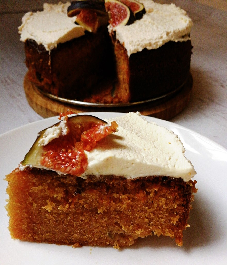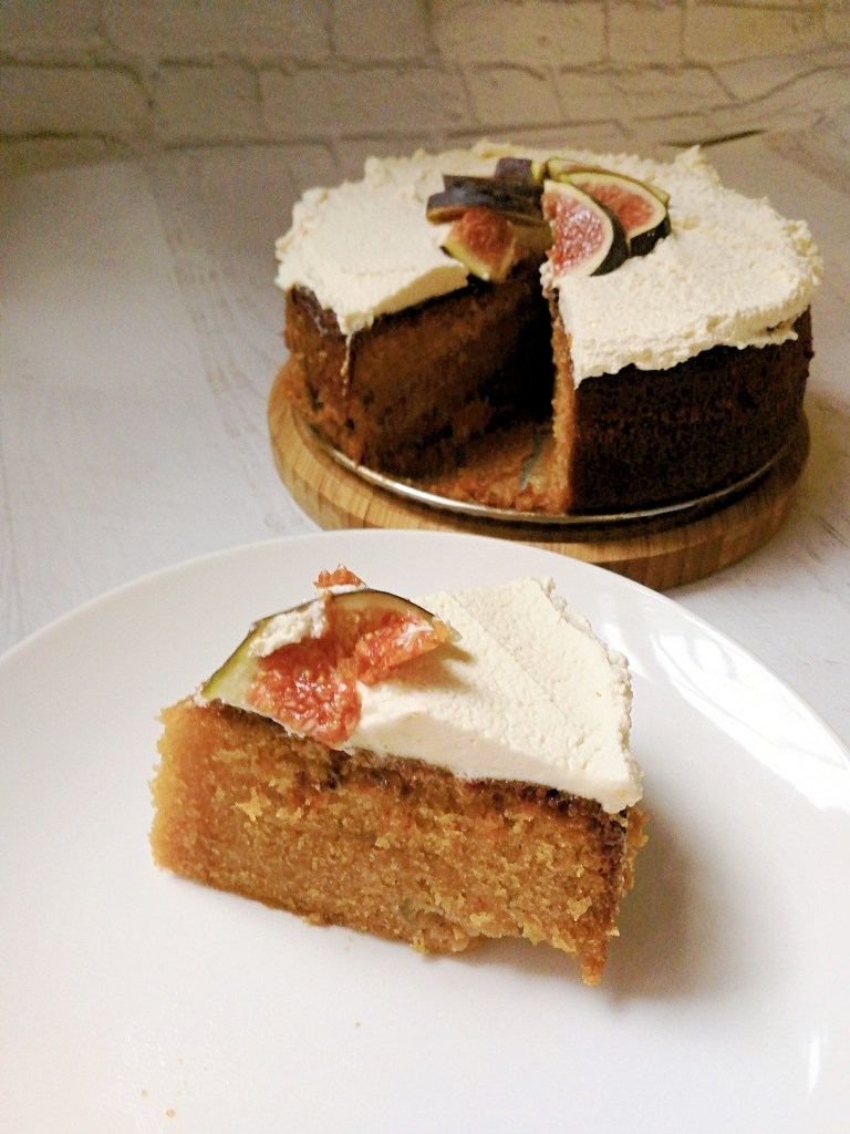 - Once cake is cool, beat cream with vanilla just until stiff peaks form. Spread the cream over the cake, then decorate with the fig slices.