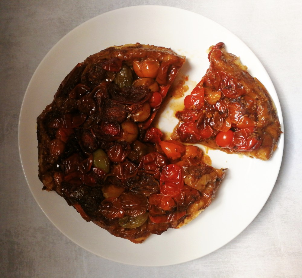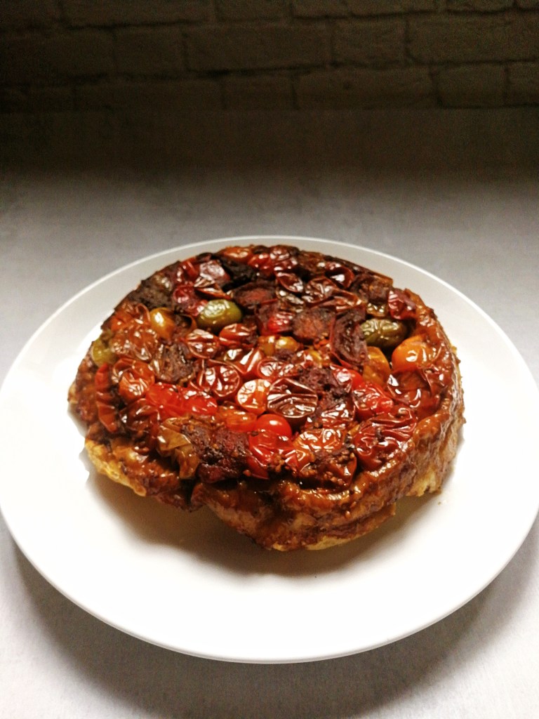 Make sure you cook off as much liquid as you possibly can, because you don’t want the pastry to be soggy, and you don’t want the tarte tatin to fall apart. Caramelising the tomatoes, or any vegetables for this dish, ensure that they get a bit sticky and come together, rather than falling apart as soon as you turn the skillet over onto a plate.
