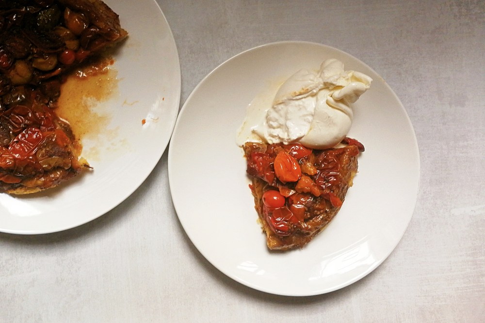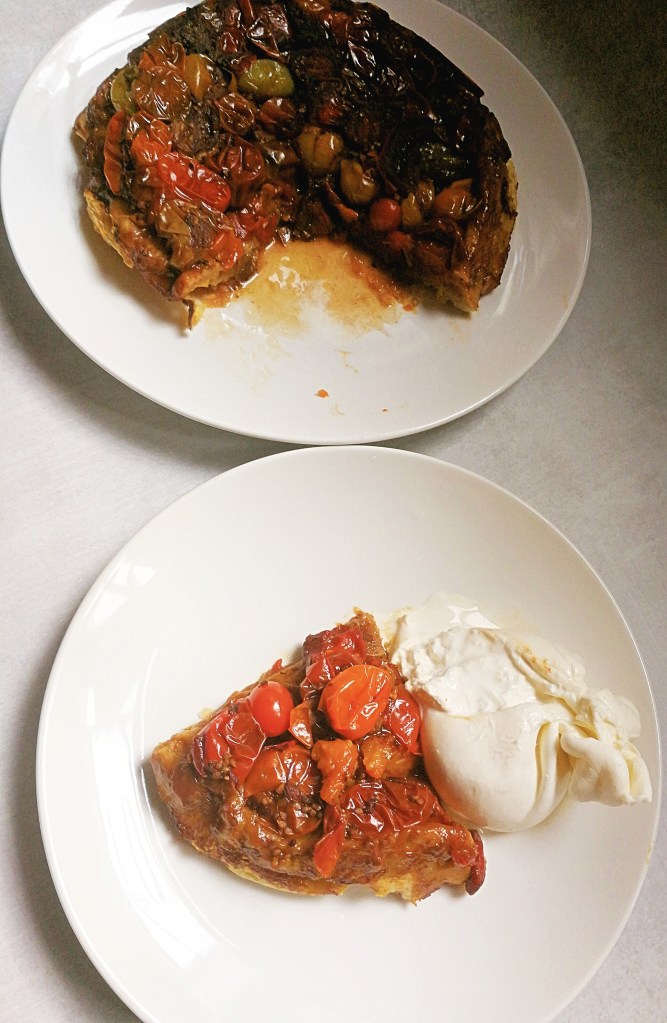 - Carefully turn out your tarte tatin by placing a plate over the skillet, and turning it upside down. Serve warm with room temperature burrata.
