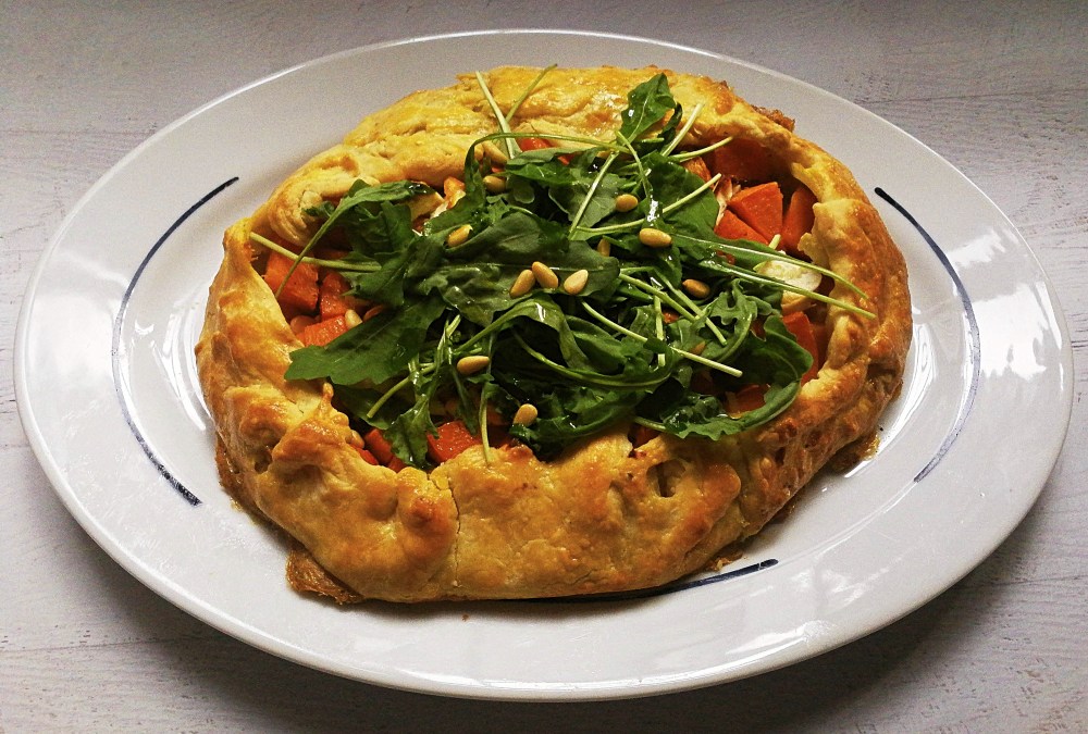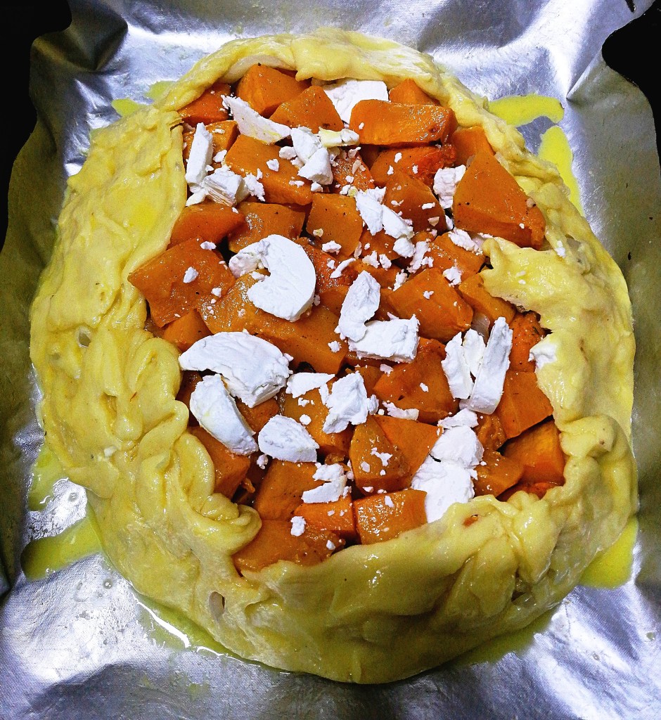 - Tear up the goat’s cheese and sprinkle over the squash. Fold the edges of the pastry up and around the fillings. Brush the pastry with the egg wash.