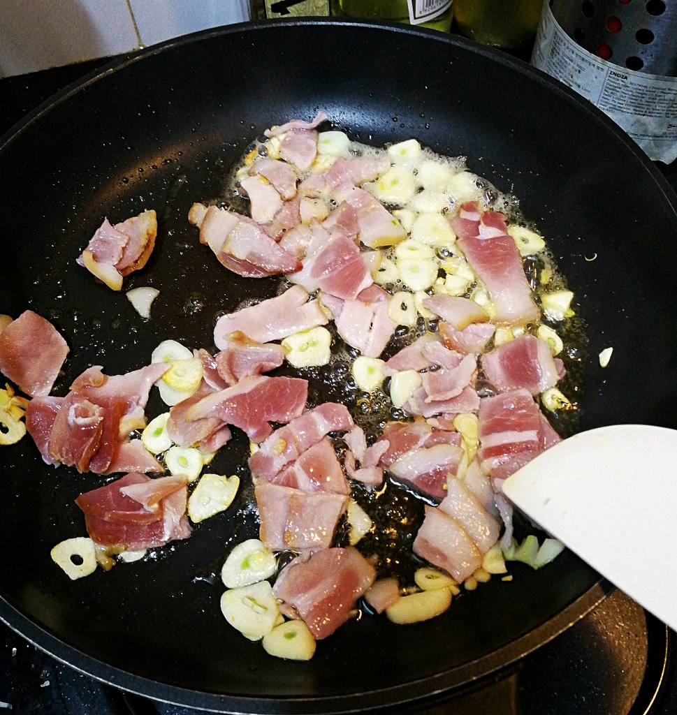 - In a frying pan, add some olive oil and turn the heat up to medium-high. Add the bacon to the pan, and cook for 3 – 4 minutes, then add the garlic and cook for a further 2 minutes.