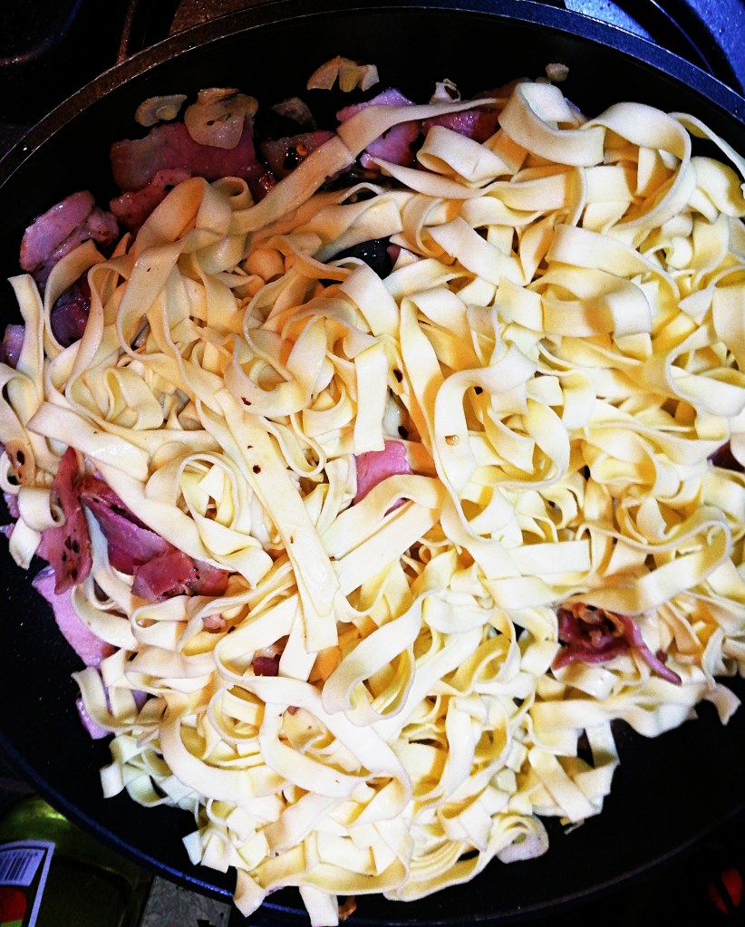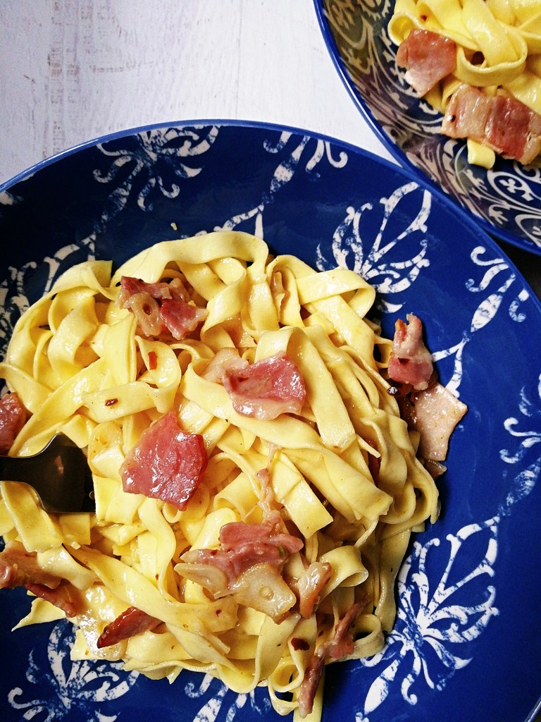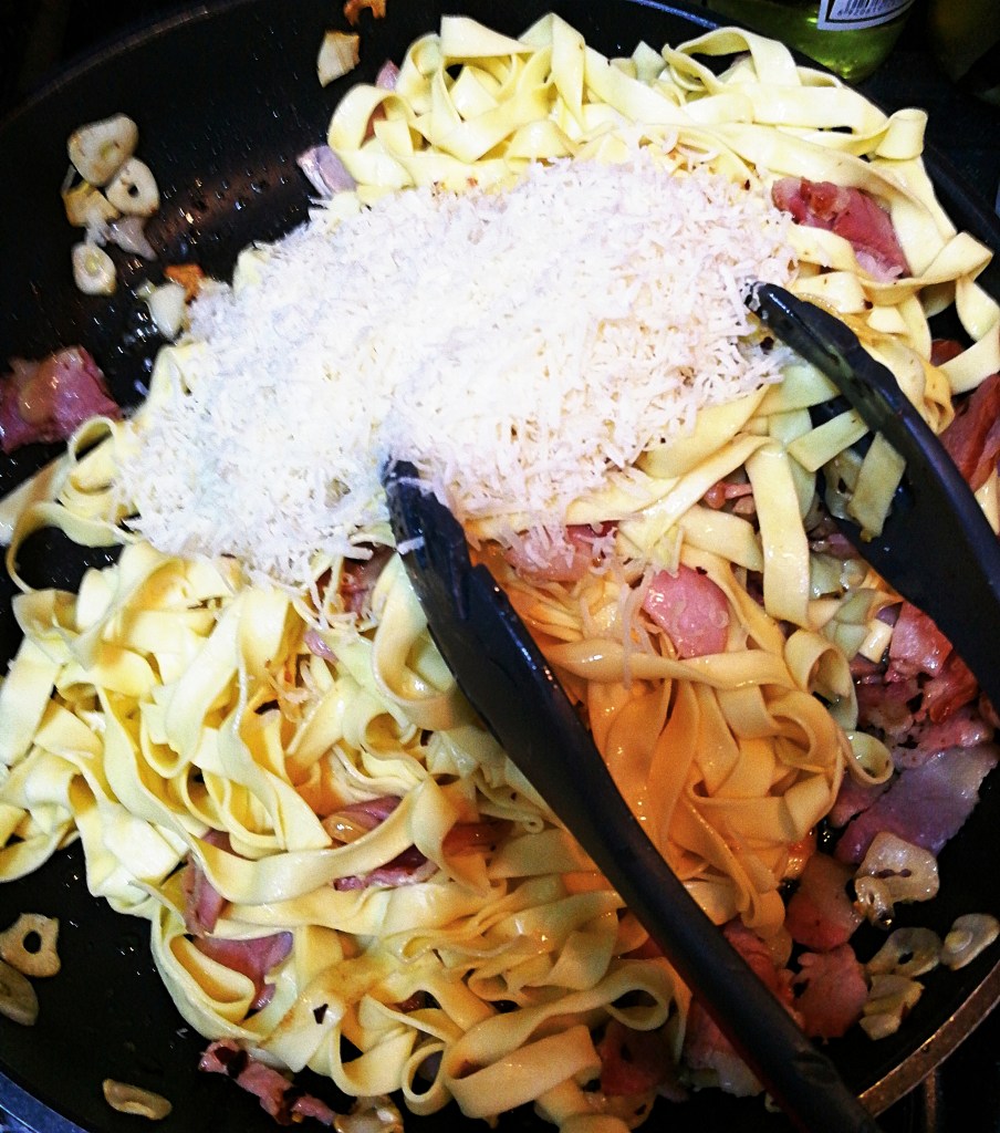 It’s a sort of mixture between aglio e olio, carbonara and cacio e pepe. It’s delicious, it really is.
