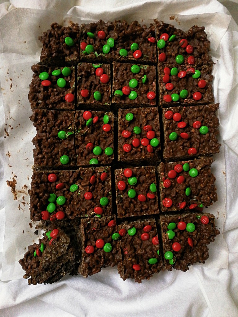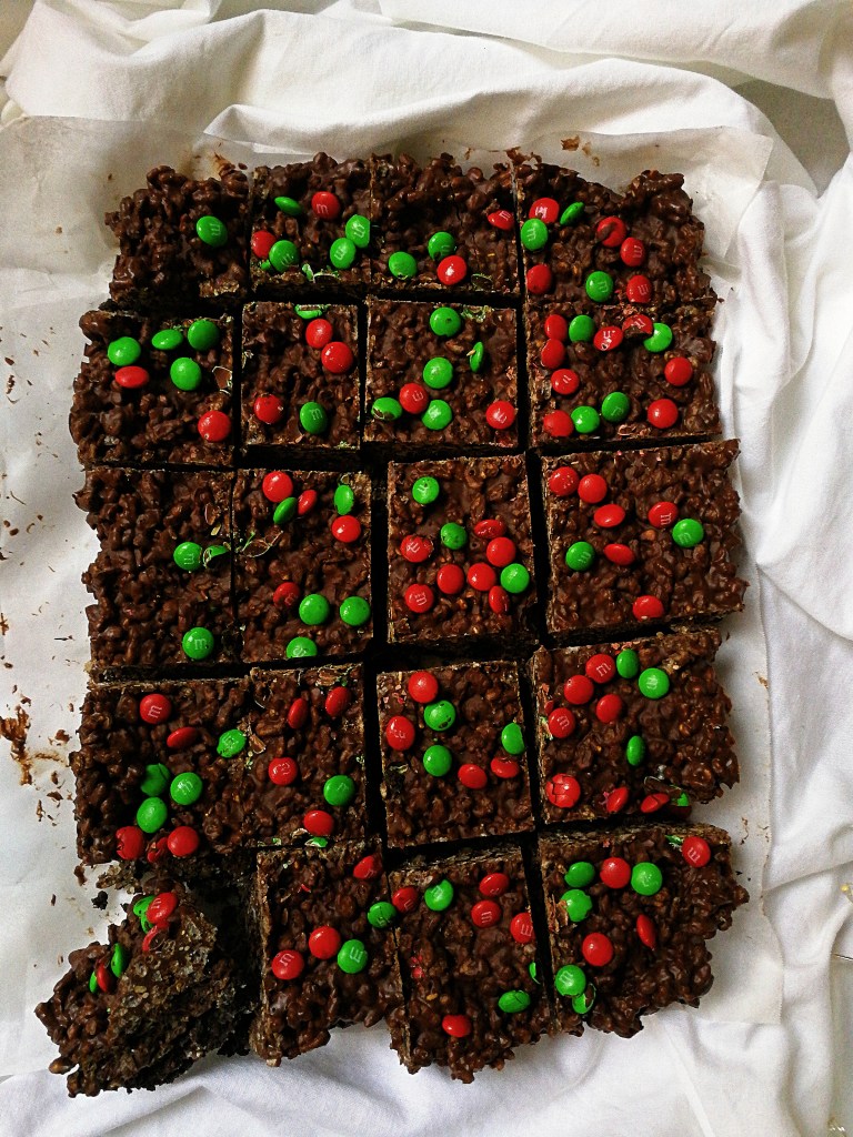 - In a double boiler, melt the chocolate over simmering water. Once melted, remove from the heat. Stir through the peanut butter. Add the Rice Krispies and mix through. Add M&Ms, or chosen chocolate, reserving some for the topping.