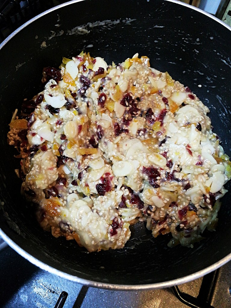- Melt the butter and sugar in a saucepan over low heat, then beat in the flour and cream for a few minutes until you get a light, caramel-type sauce. Remove from the heat and stir in the chopped cranberries, citrus peel, almonds and sesame seeds. Mix thoroughly until everything is combined well.