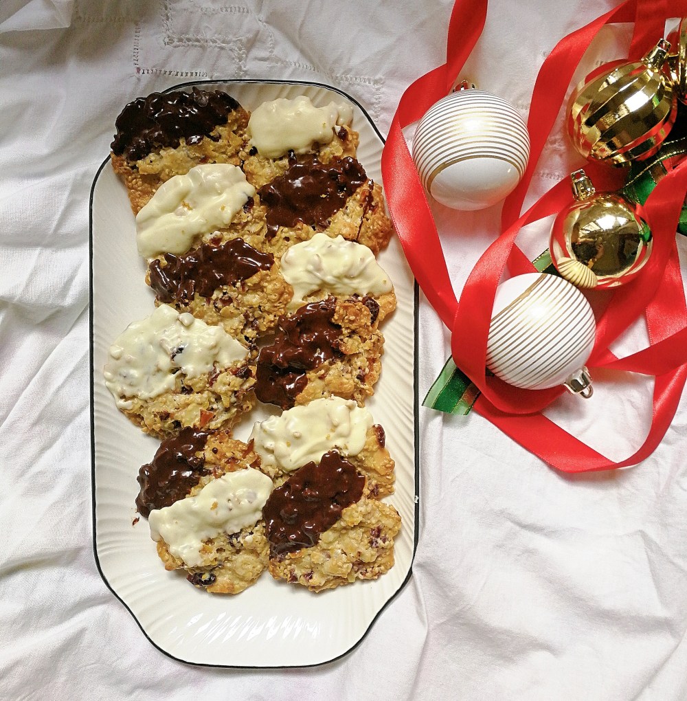 - Once completely cooled, melt the white chocolate and 3 tablespoons of coconut oil in a saucepan. Once fully melted, remove from the heat. Dip half of the florentines into the white chocolate, covering just half of each biscuit. Repeat with the dark chocolate, and dip the remaining florentines into the dark chocolate.