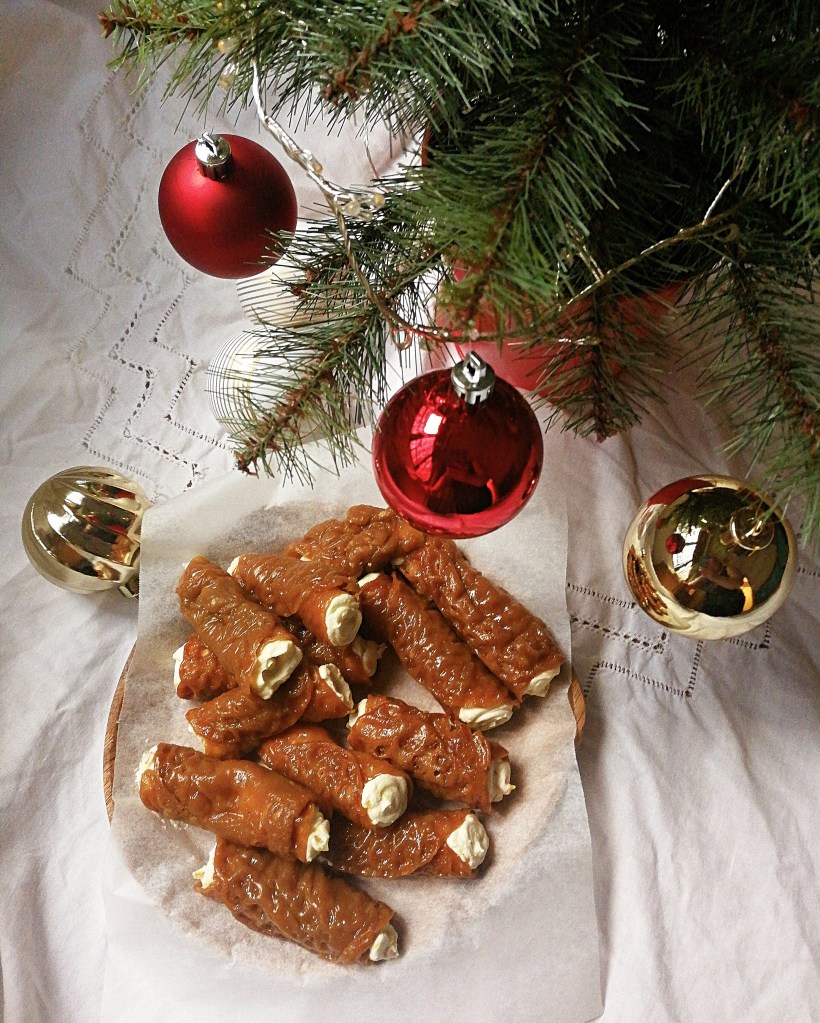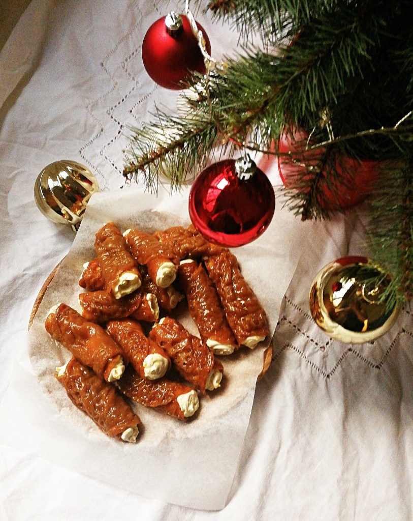 I, funny enough, don’t own a single wooden spoon. I own bamboo turners, silicon spoons and spatulas, metal slotted spoons and ladles, but no wooden spoons. So, I used what I had available to make the cannoli shape of the brandy snaps. Use what you’ve got.