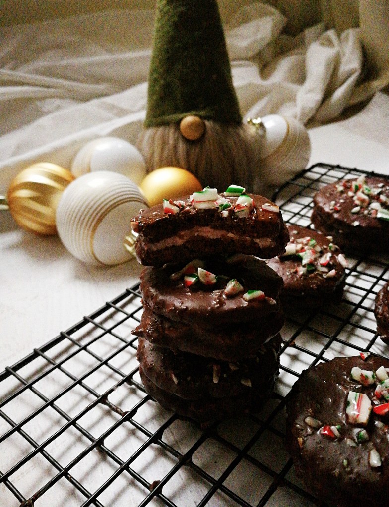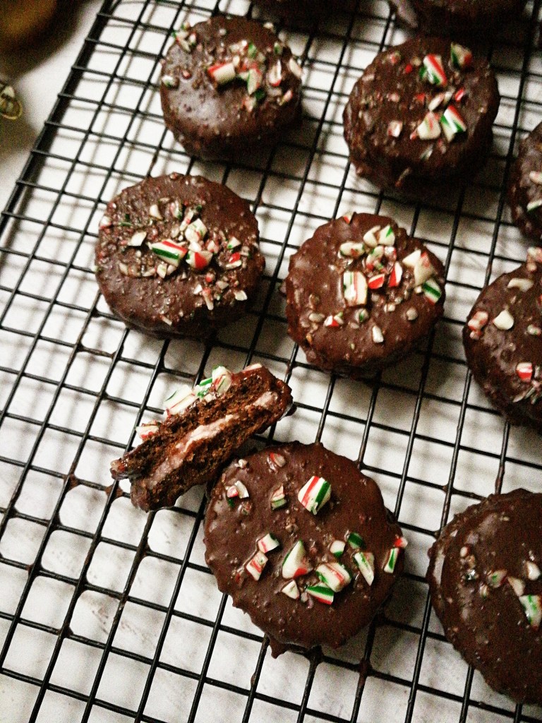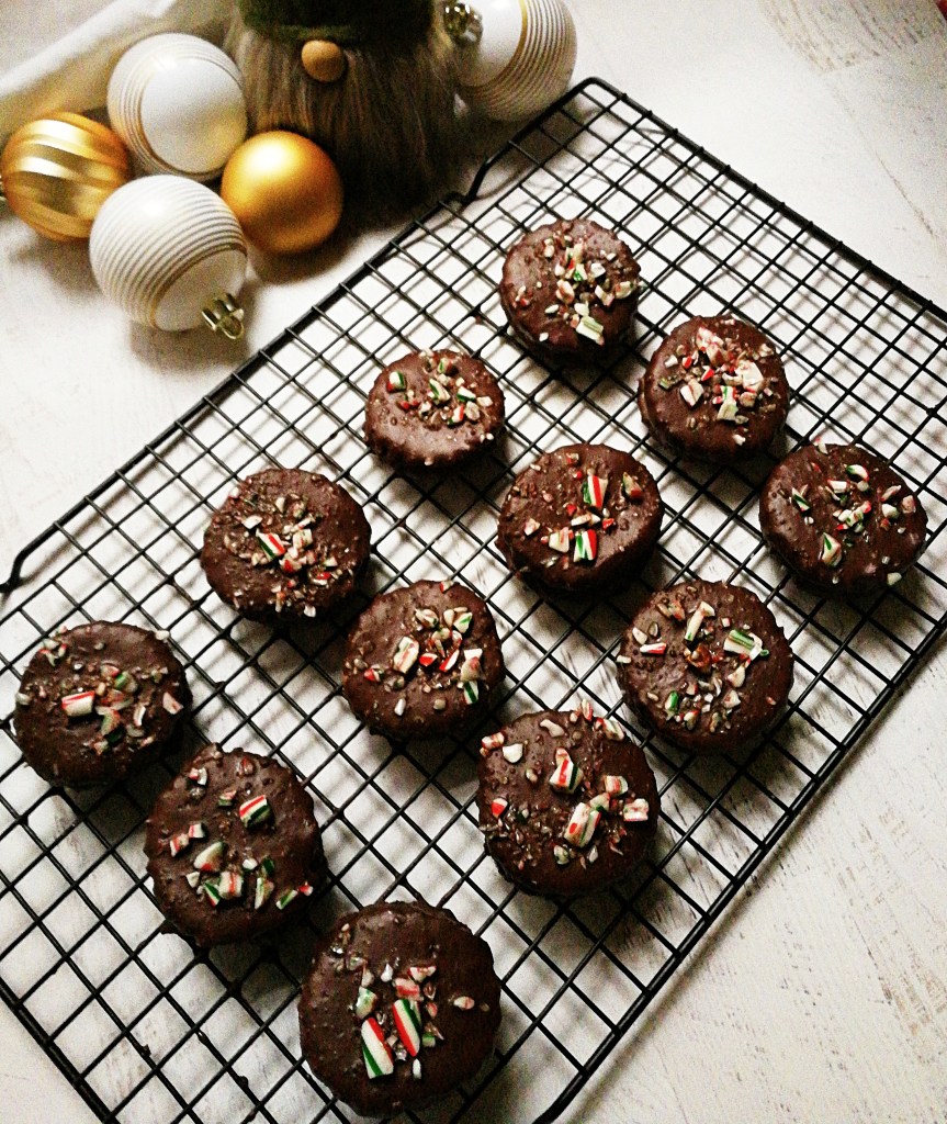 - Take the biscuits out of the fridge, and carefully dunk both sides of the biscuit sandwich into the melted chocolate. Make sure the sides are coated too. Place on a wire rack covered with parchment paper. Sprinkle with crushed candy canes. Once all biscuits are coated, place the wire rack in the fridge until fully set.
