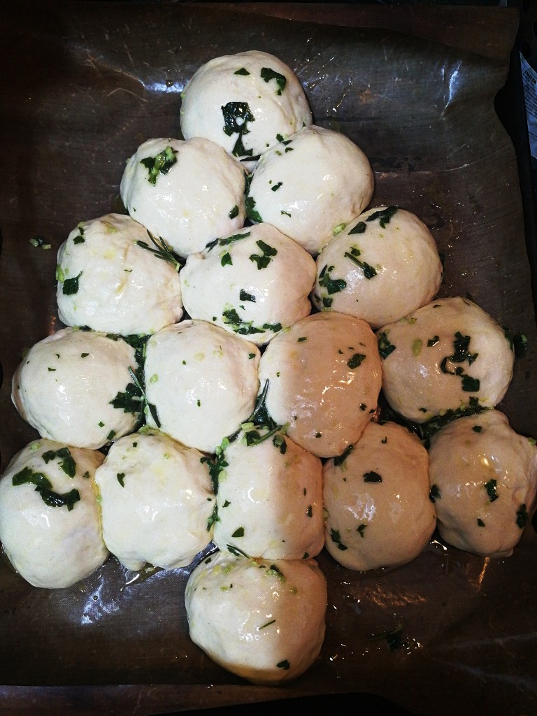 I’d seen loads of different pull-apart breads before, and have seen them shaped into all sorts of things – including Christmas trees. I decided I wanted to have a go as well. Garlic dough balls from Pizza Express have always been my favourite thing to eat when I go there, so I figured I could just make my own, and give it a Christmas theme.