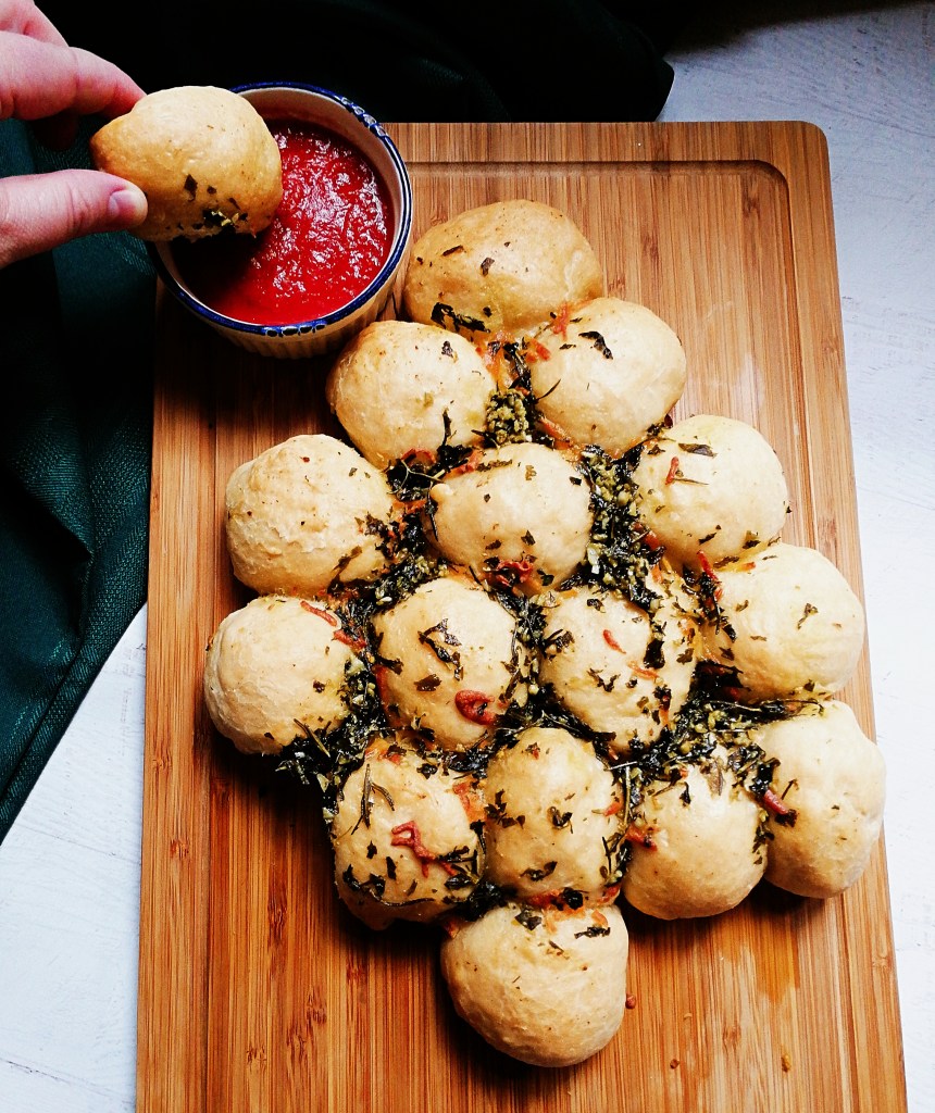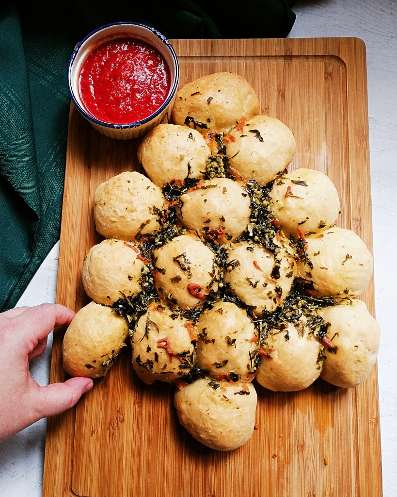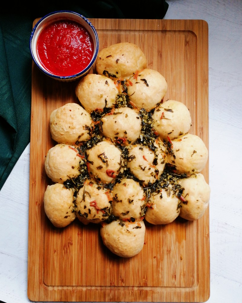 - Allow to cool slightly, while you make the marinara sauce. In a saucepan, add the crushed tomatoes, remaining minced garlic, oregano, salt, pepper and olive oil. Bring to a boil over medium heat, reduce the heat to low and allow to simmer for 15 – 20 minutes. until sauce has thickened. Pour the sauce into a shallow bowl or ramekin, and serve alongside your Christmas tree bread.