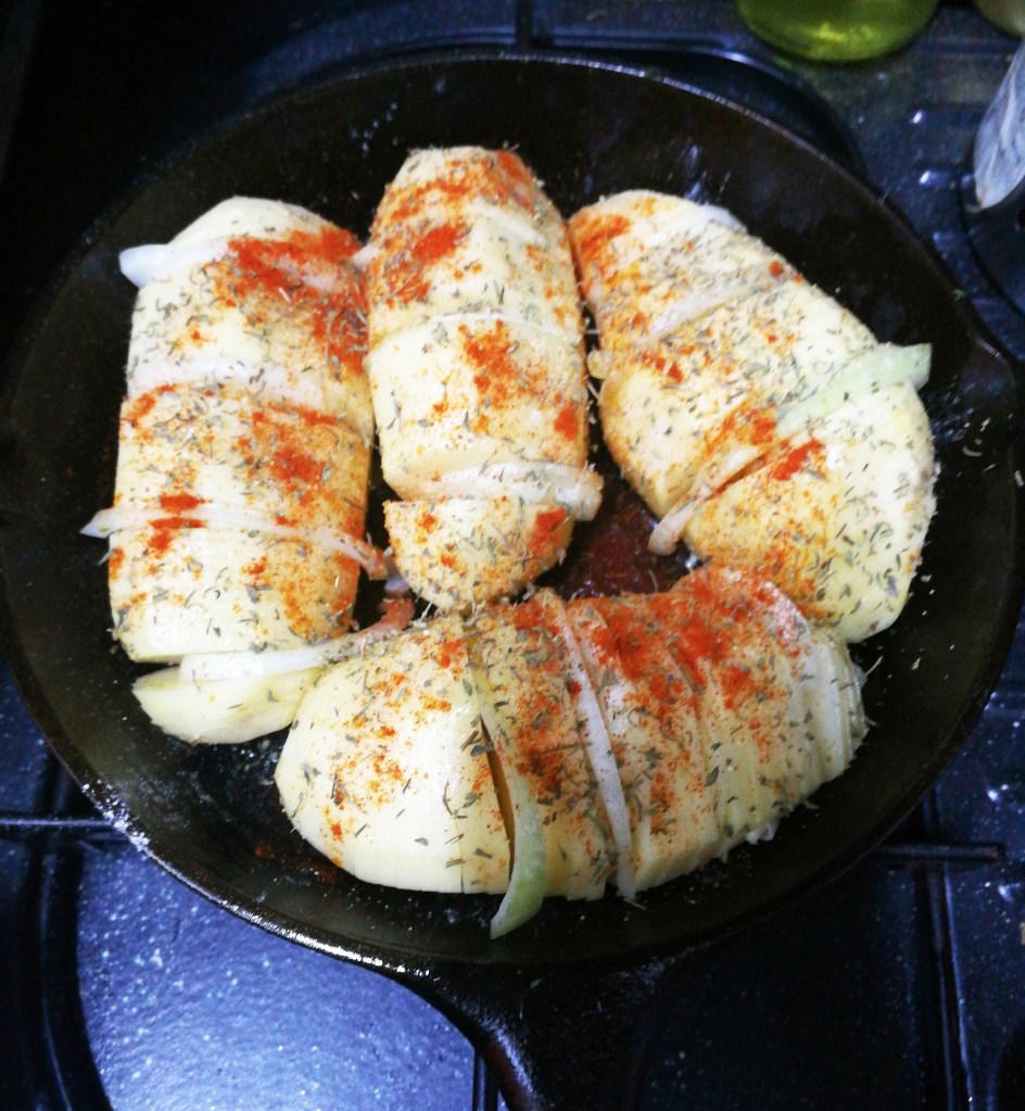 - Using two wooden spoons, parallel to a potato, slice very thinly along the potato. The wooden spoons will stop you from going all the way through. Place the potatoes in the skillet as you finish each one. Wedge slices of onion in between some of the potato slices.
