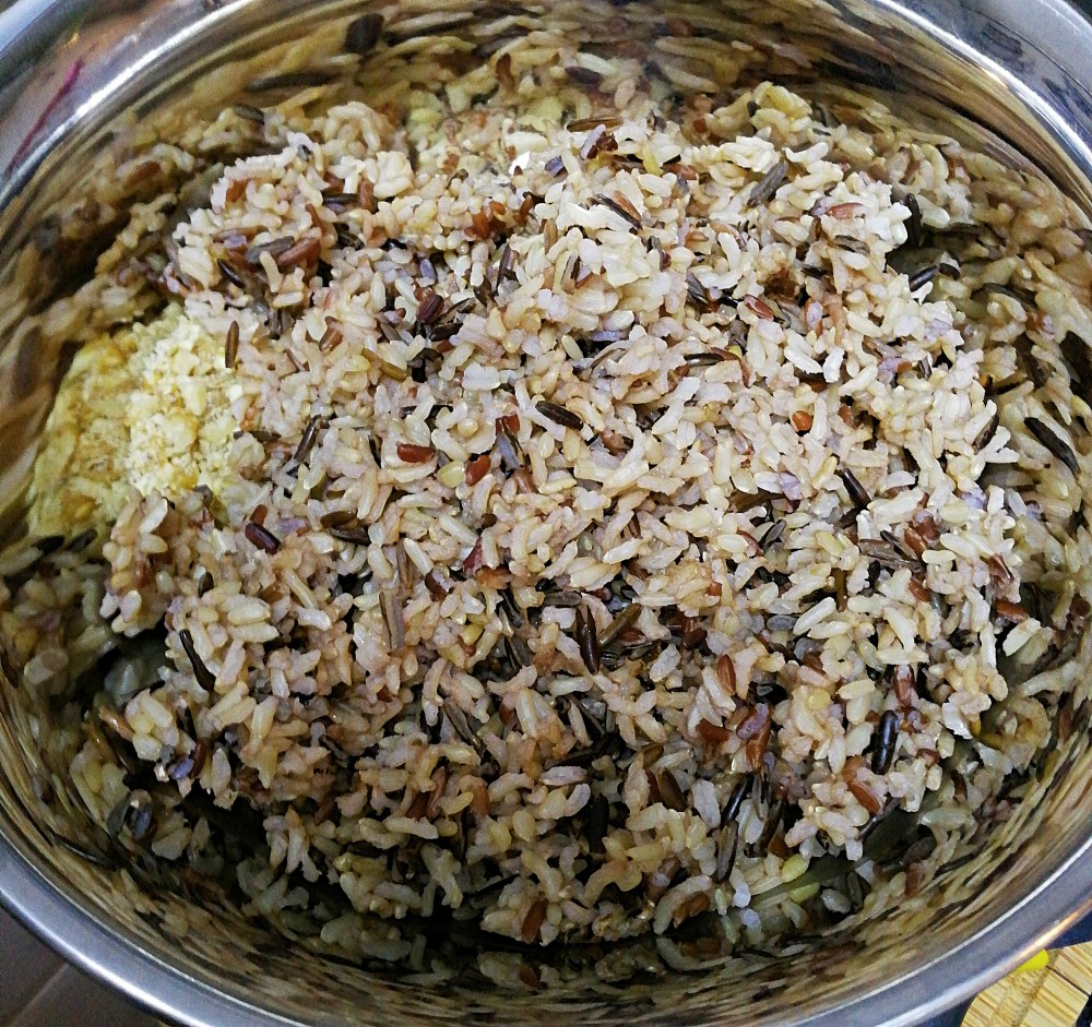 - In a large bowl, mix the nuts and brown rice.