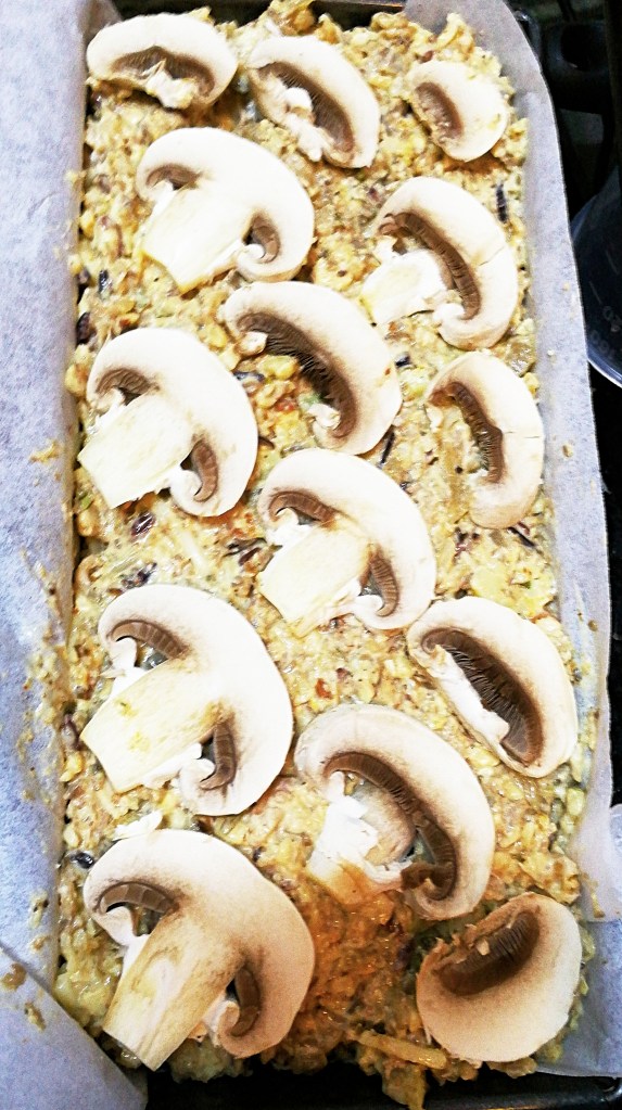- Fill the prepared loaf tin with the nut mixture. Tap the loaf tin on the counter to release any trapped air bubbles. Smooth with a spatula, and decorate with the finely sliced mushrooms.