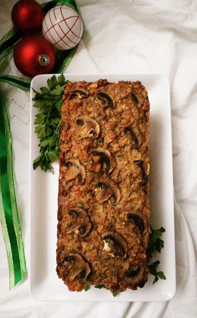 You can decorate the top of the loaf with extra mushrooms, or you can decorate with any other vegetables that you have in the house. Vegetables are great to serve with this nut roast.