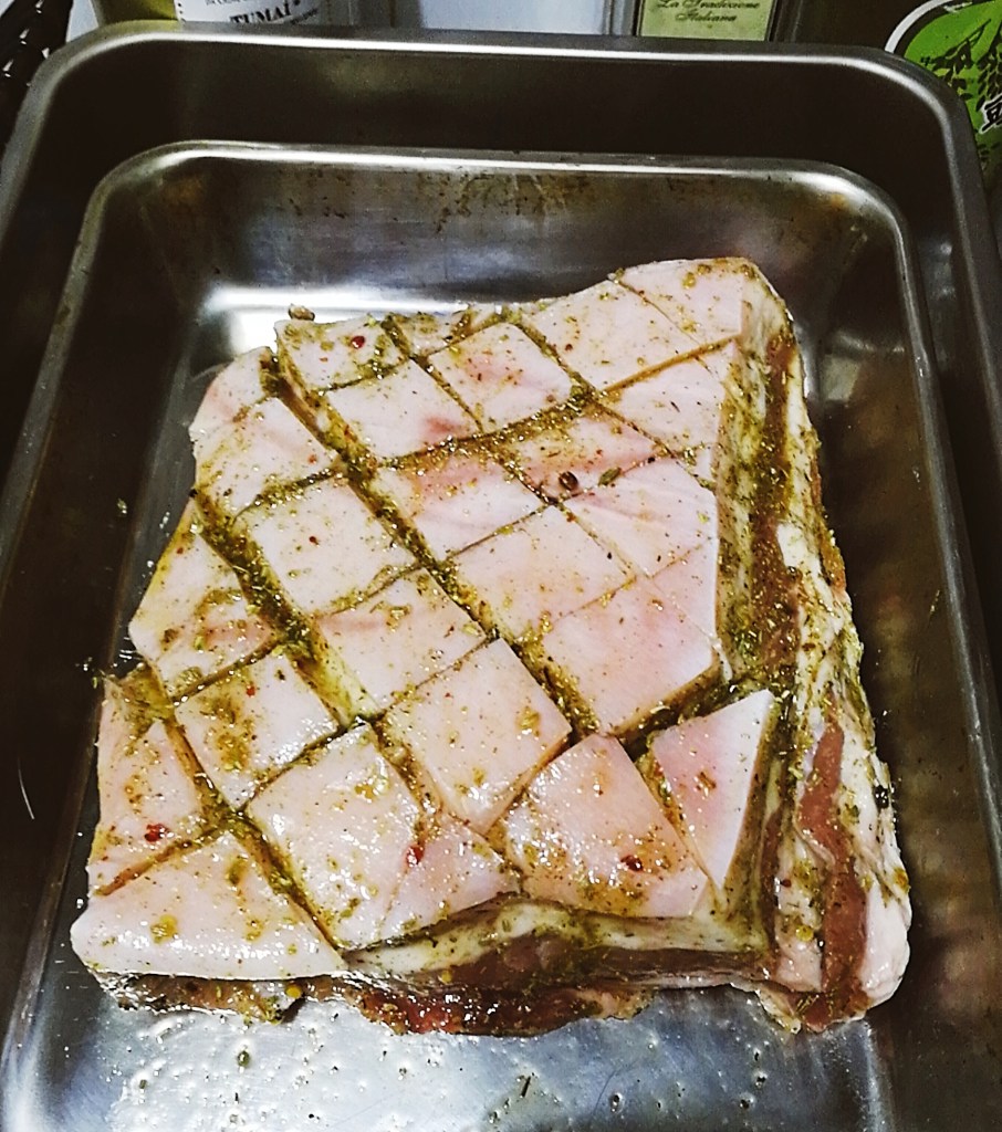 - Place your pork belly in a roasting tin. Score the skin of the pork in a crisscross pattern.