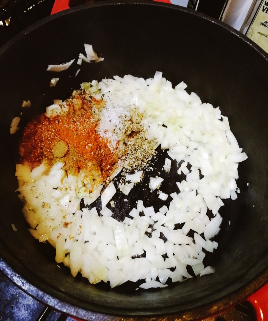 - Place a dutch oven over medium heat on the hob, and add the olive oil. Make sure the oil coats the entire bottom of the pot. Once hot, add the onions and garlic and saute for a few minutes. Stir occasionally.